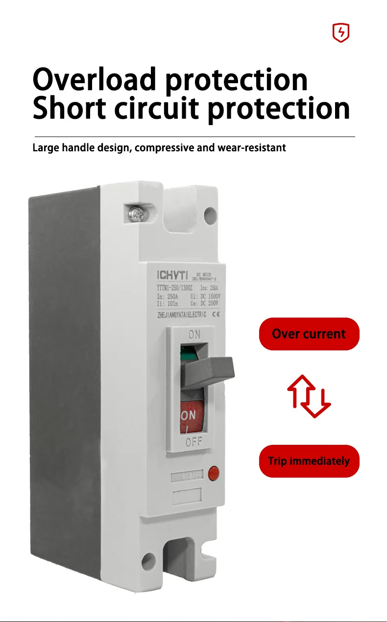 YTTMI-250/PV2 в основном используется для электросети постоянного тока elctricity, такой как pv солнечная энергия, энергия ветра, гидроэнергия, автомобиль и любое устройство питания постоянного тока. YTTMI-250/PV2 имеет до 25ka разрывной мощности, используется для DC24V-1000V линий, максимальный ток до 1250A