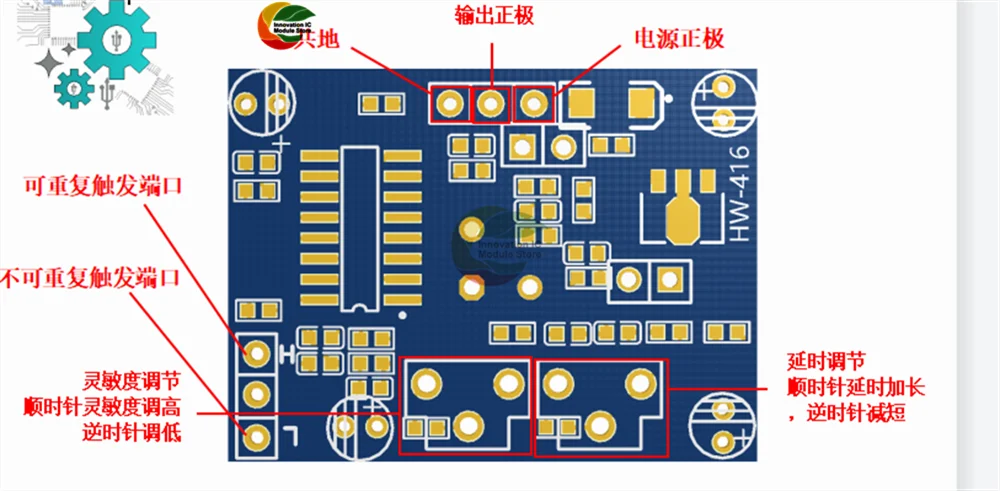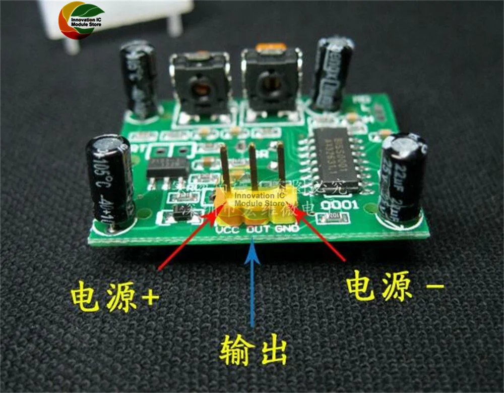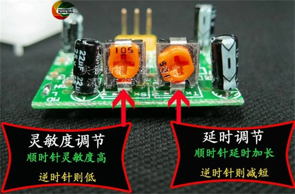 Примечание: потенциометр по часовой стрелке для регулировки расстояния, дальность срабатывания увеличивается (около 7 метров), напротив,