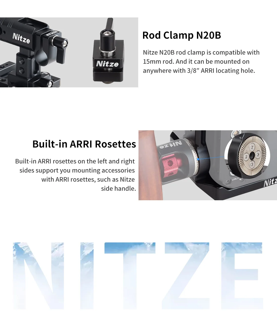 2. Встроенные рельсы NATO и розетки ARRI с левой и правой сторон делают ваши аксессуары более быстрыми и удобными, вы можете прикрепить боковые ручки серии PA22 для ручной съемки.