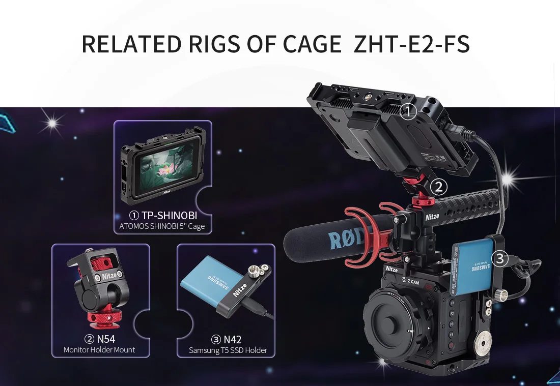 1. Комплект для камеры Nitze ZHT-E2-FS совместим с камерой Z Cam E2-M4/S6/F6/F8 и имеет модульный и легкий дизайн. Включает ручку PA14 NATO и TP-E2-FS клетку.