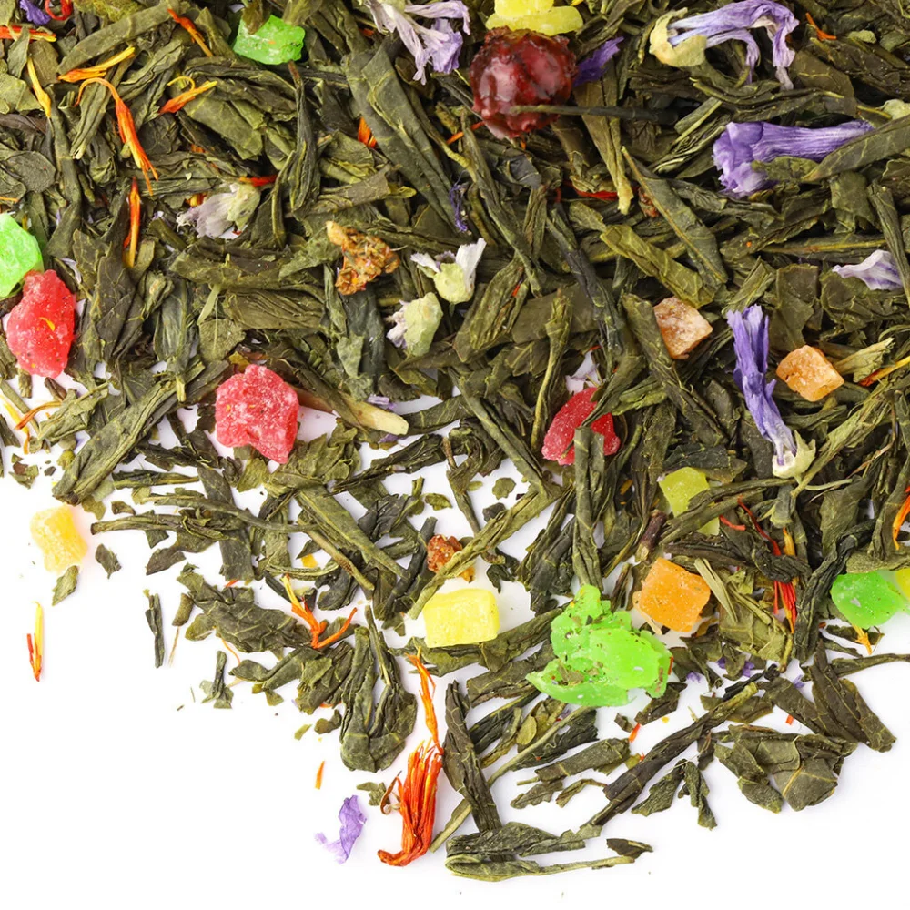 Состав: Китайский зеленый чай Сенча, ягоды красной смородины, кусочки ананаса и клубники, мальва, сафлор.