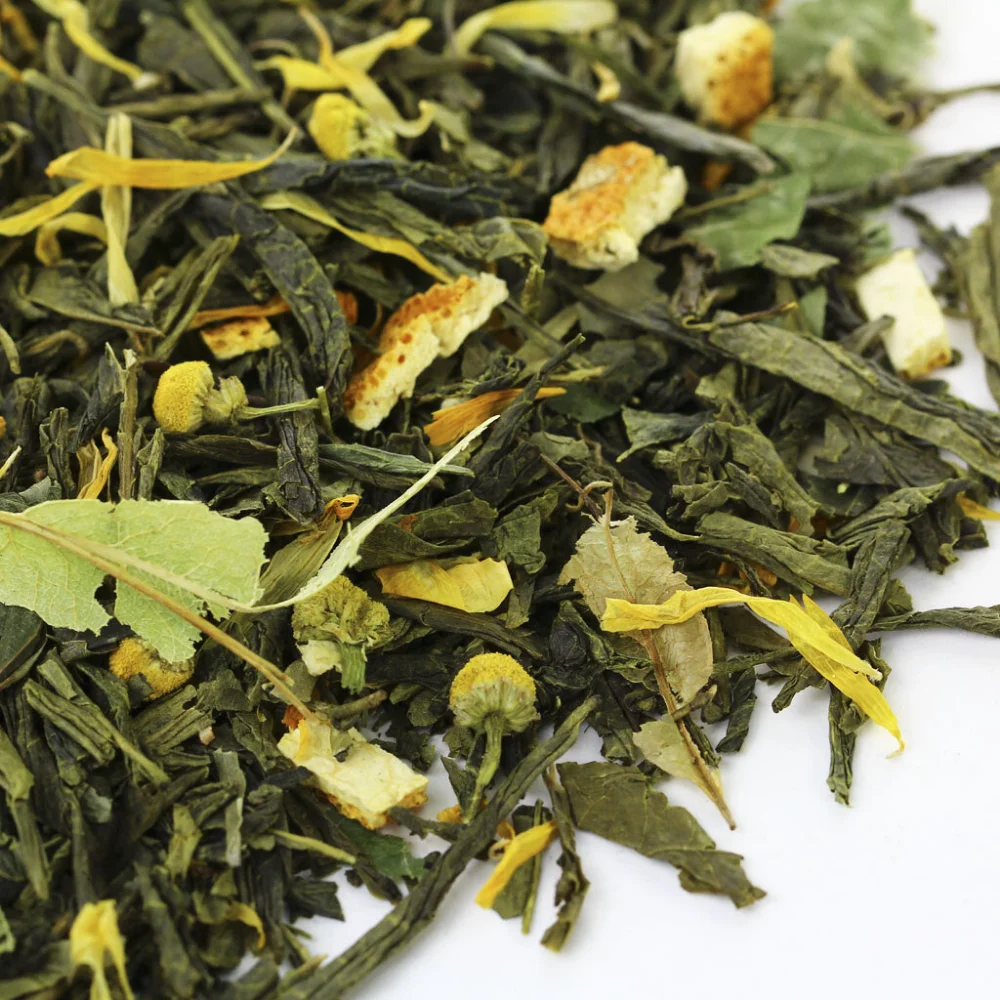 Состав: Китайский зеленый чай Сенча, ромашка, липа, лепестки календулы, цедра апельсина.