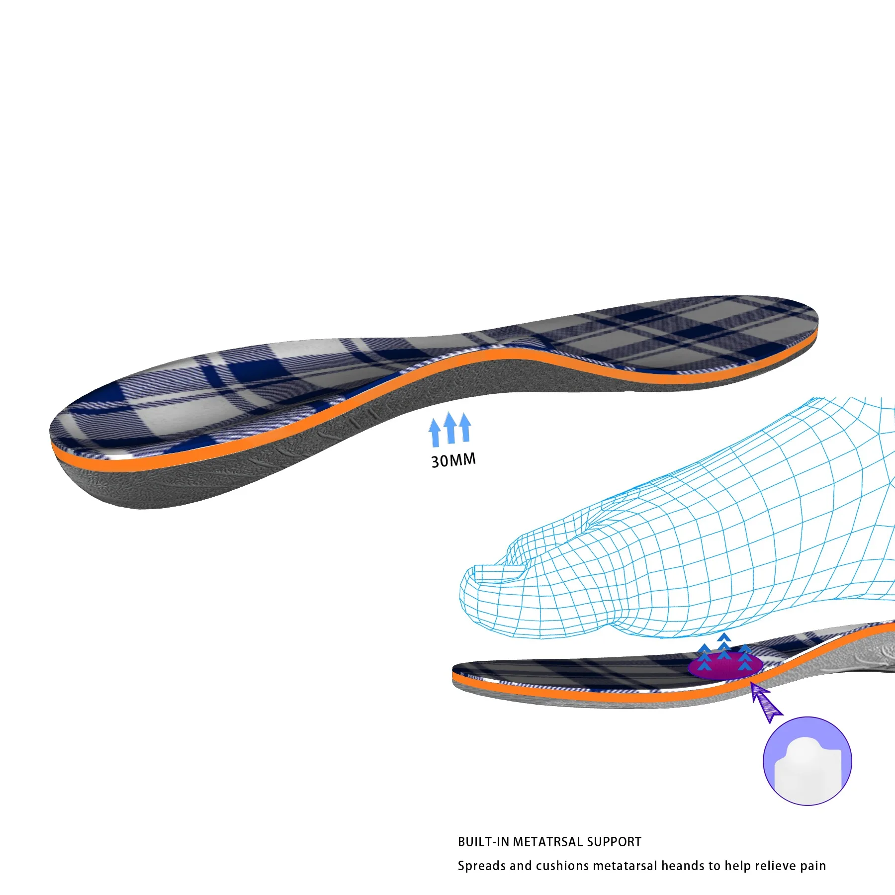 Метатарзальный опора подушки имеют функцию массажа. Вы можете чувствовать себя неровно, когда надеваете их. Также ваши ноги могут чувствовать себя некомфортно, но они могут уменьшить давление и усталость ваших ног. Высота дужки стопы составляет 30 мм, что обеспечивает поддержку свода и комфорт для пациентов с подошвенным фасциитом и болью в пятке и повышает стабильность.