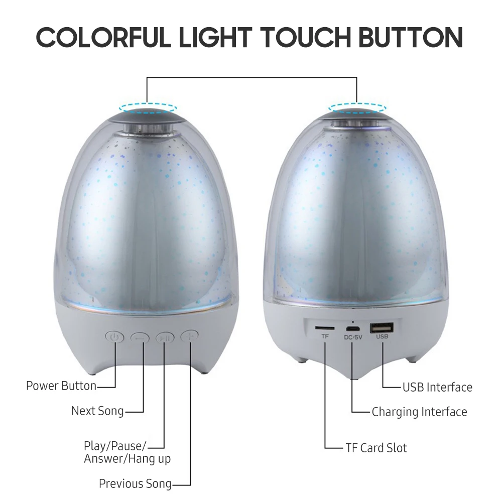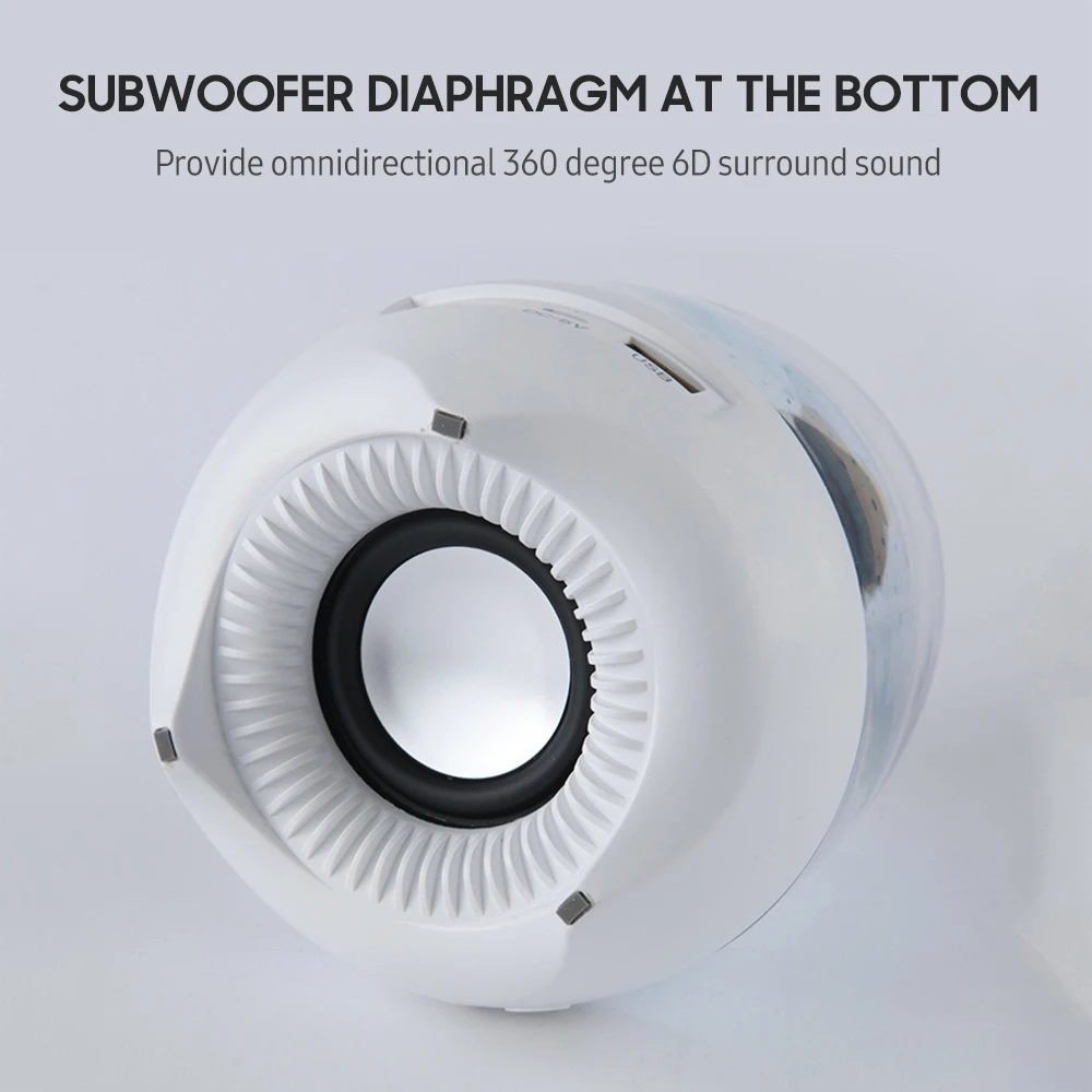 Музыкальный проигрыватель: внутренний магнитный Рог с диафрагмой сабвуфера в нижней части для обеспечения всенаправленного 360 градусов 6D объемного звука. Поддержка подключения BT, aux подключения, tf-карты и истинной беспроводной стерео функции для подключения влево и вправо стерео объемного звука.