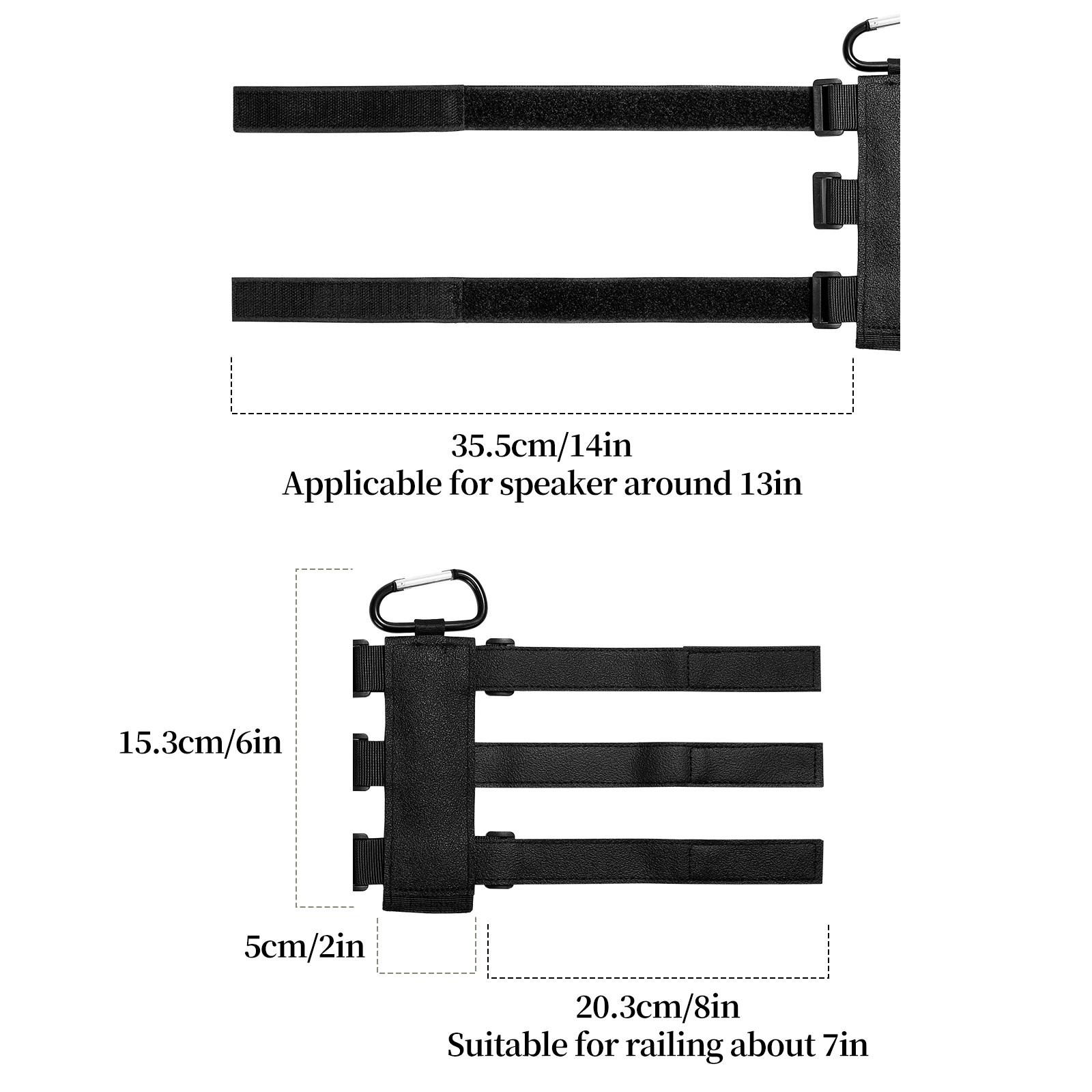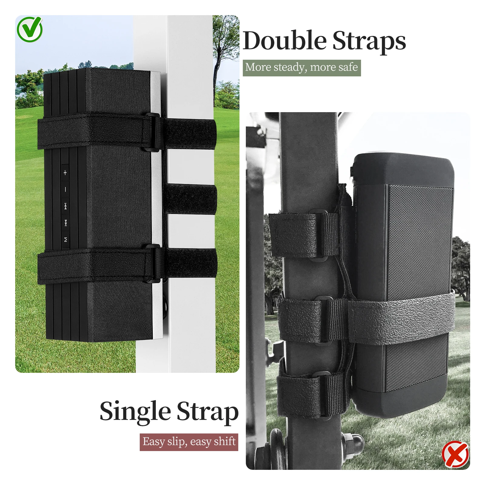 [Двойные ремни с креплением на динамик]: Два регулируемых ремешка для крепления беспроводного динамика плотно, более устойчивый и более безопасный по сравнению с одним ремешком. Подходит для большинства портативных динамиков с окружностью менее 13 дюймов и удерживает динамик без выскальзывания.
