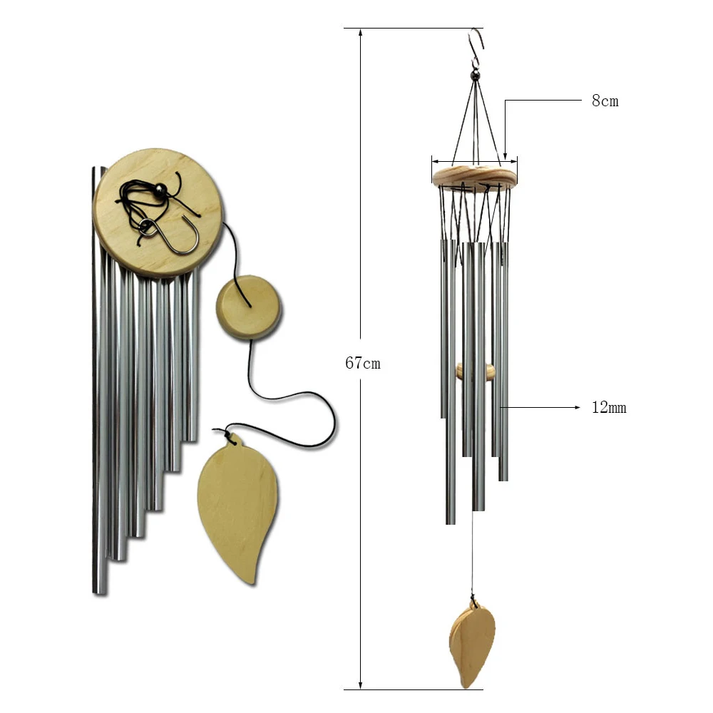 Состоит из круглой деревянной пластины и 6 алюминиевых трубок различной длины, ветряные колокольчики имеют прекрасное мастерство и хорошее качество.