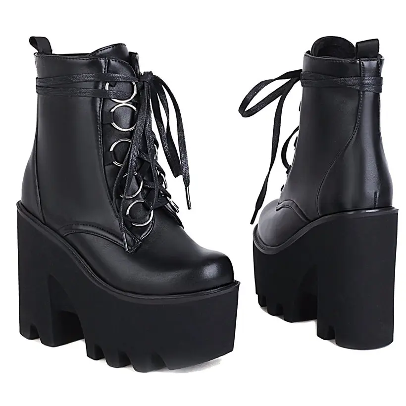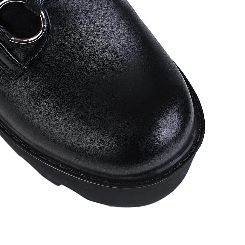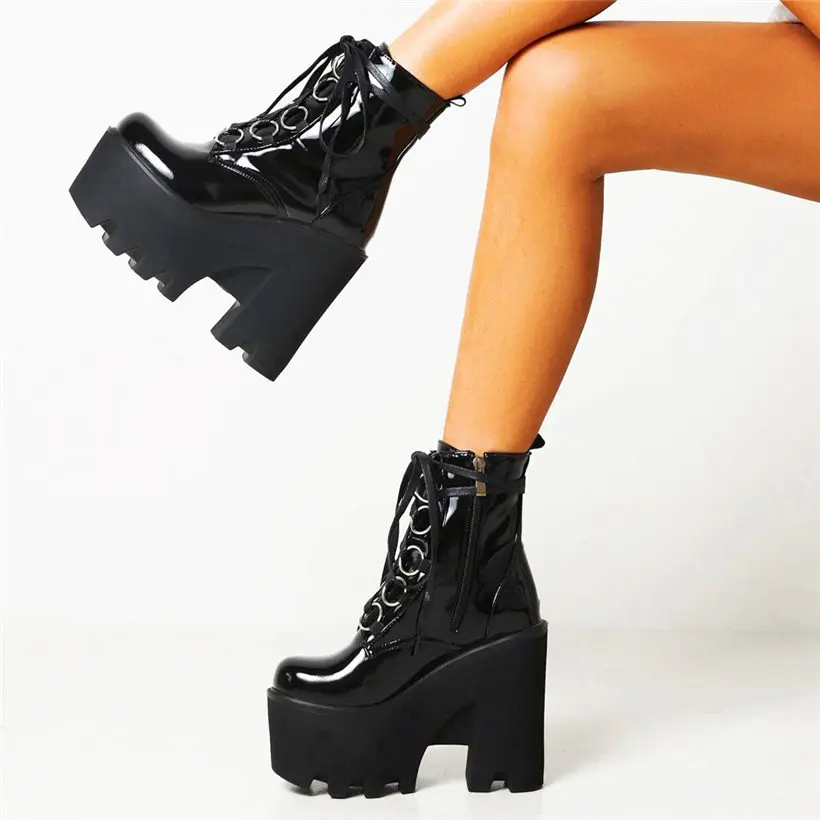 Туфли-лодочки на платформе; Женские сапоги до середины икры из лакированной кожи с круглым носком; Обувь на толстой резиновой подошве на высоком каблуке со шнуровкой и пряжкой; EUR35-43