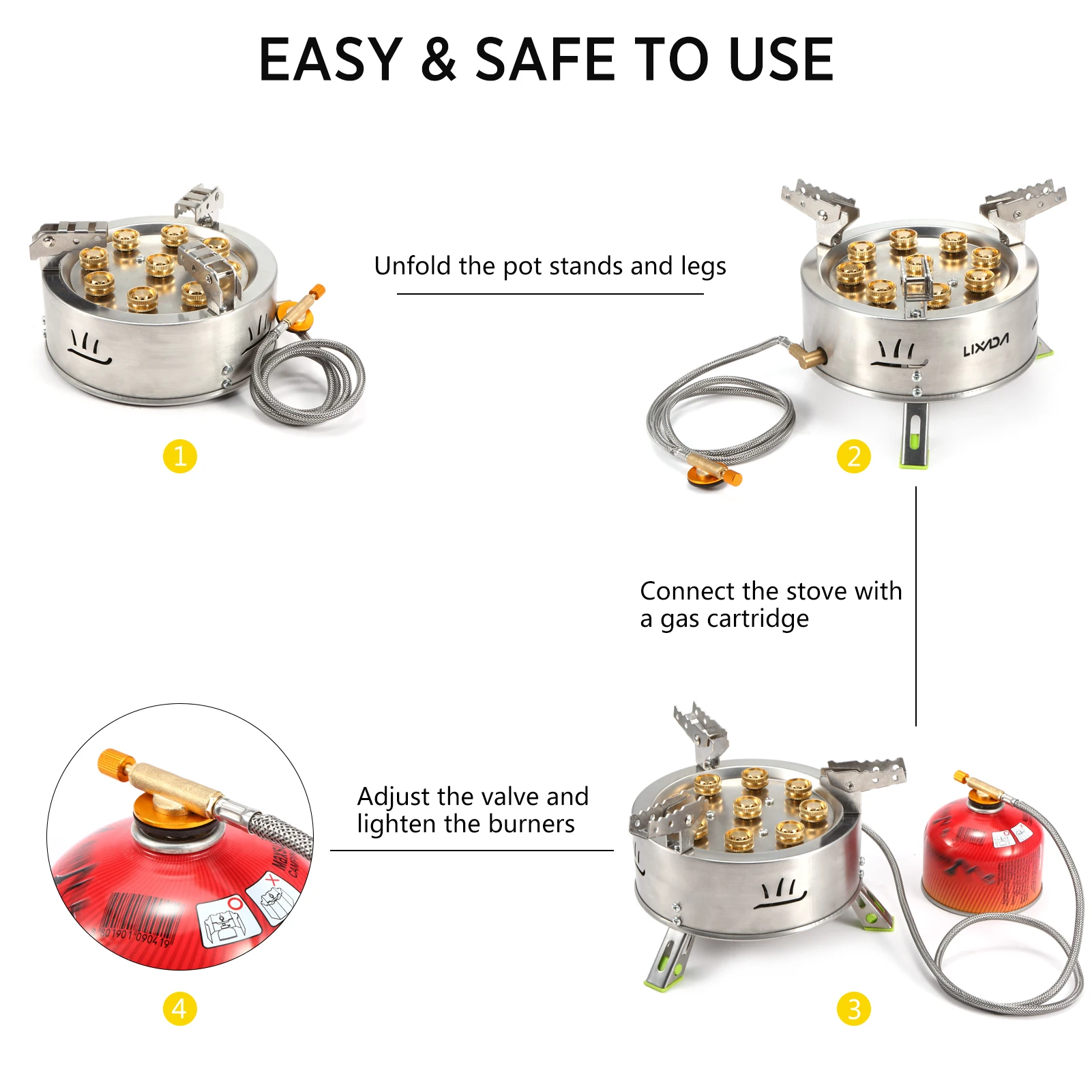 Эта уличная печь с 9 горелками, обеспечивающая мощную огненную мощность 12 800 Вт. Он изготовлен из антикоррозийной нержавеющей стали для обеспечения длительного срока службы. Складные противоскользящие подставки и ножки для кастрюль повышают устойчивость при использовании. Он идеально подходит для кемпинга, походов, пеших прогулок, пикника и других мероприятий на свежем воздухе.