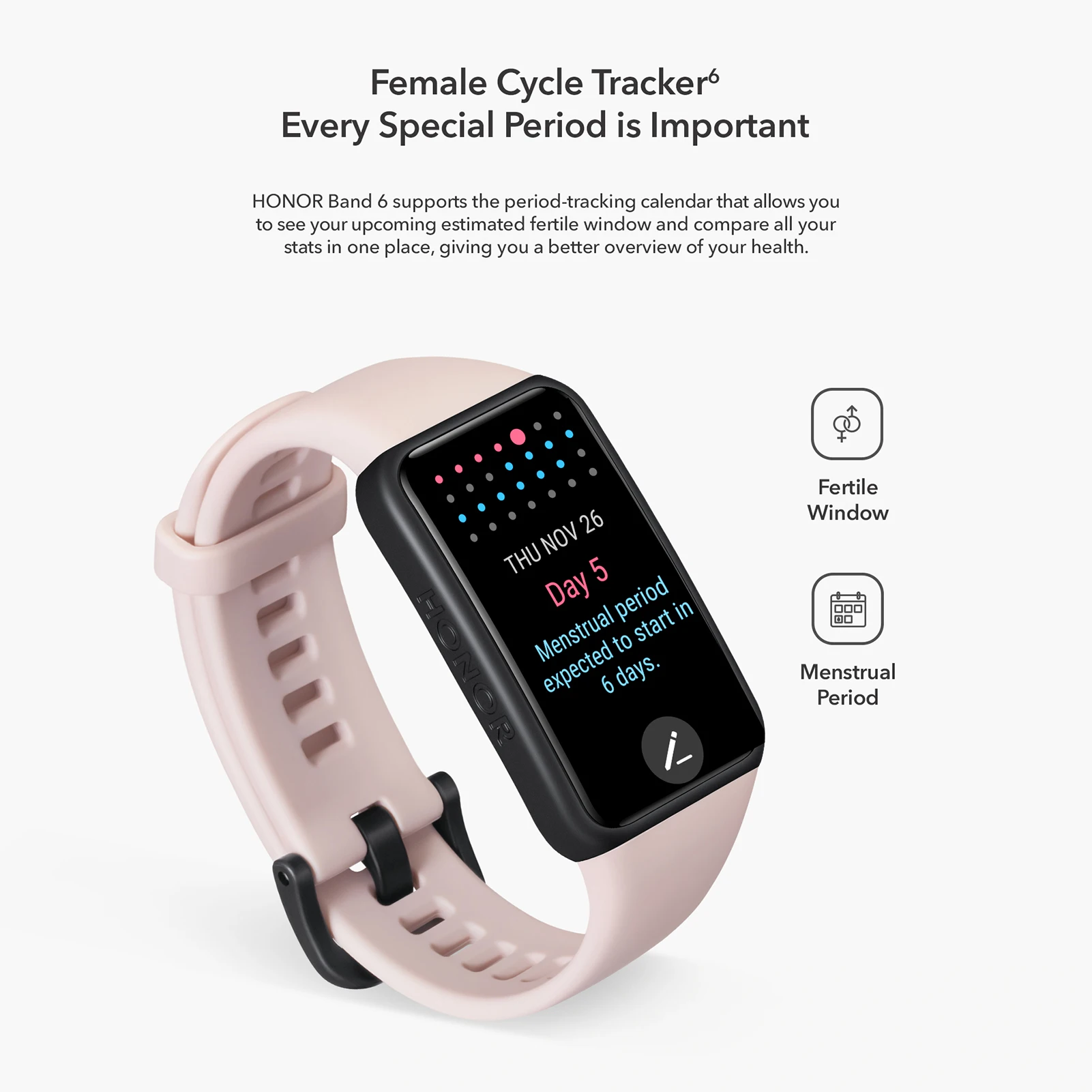 HONOR Band 6 Поддерживает календарь для отслеживания периода, который позволяет вам видеть ваше ожидаемое окно плодородия и сравнить все ваши показатели в одном месте, что дает вам лучший обзор вашего здоровья.