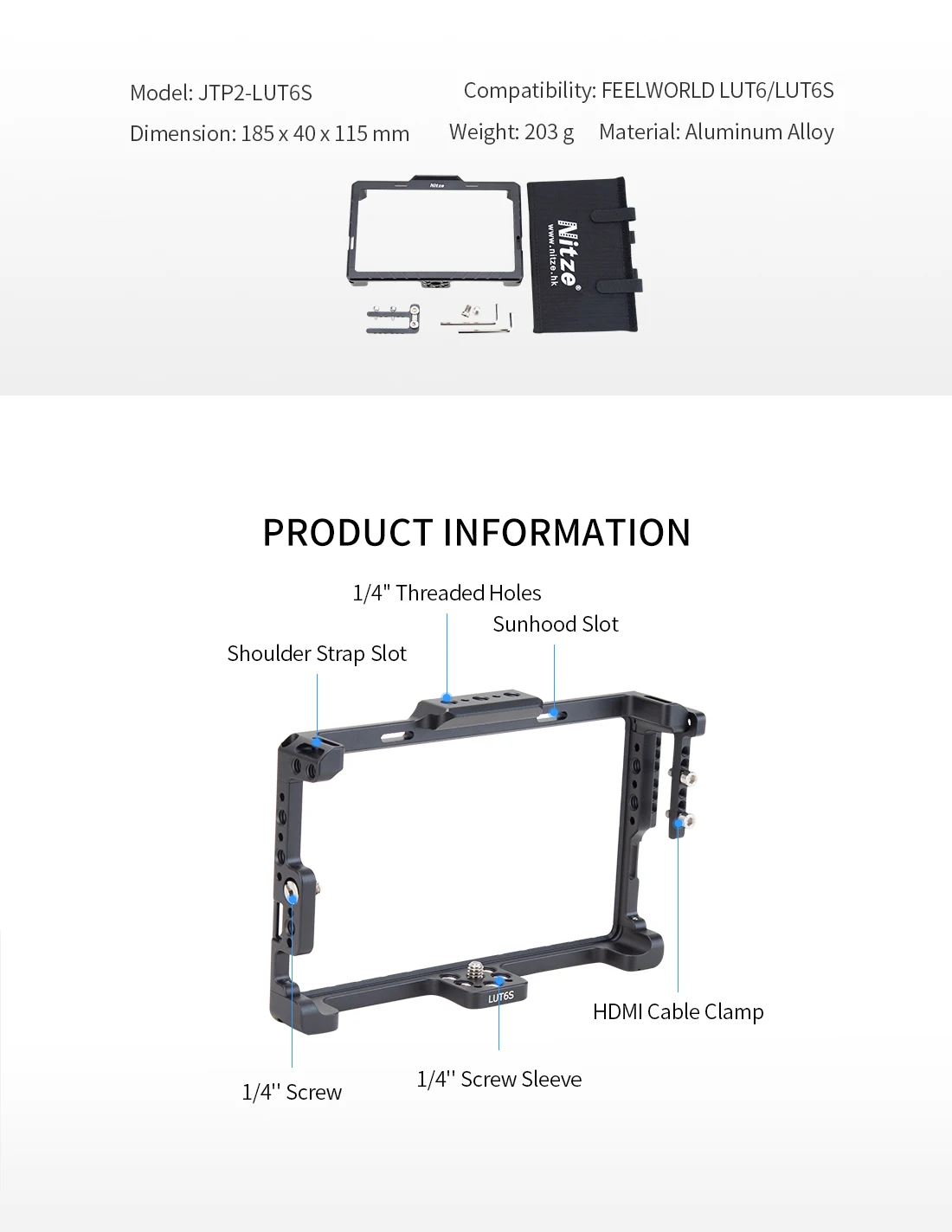1. Клетка для JTP2-LUT6S Nitze с солнцезащитным колпаком для монитора Feelworld LUT6 / LUT6S 6 "предназначена для обеспечения всесторонней защиты вашего монитора, не препятствуя работе.