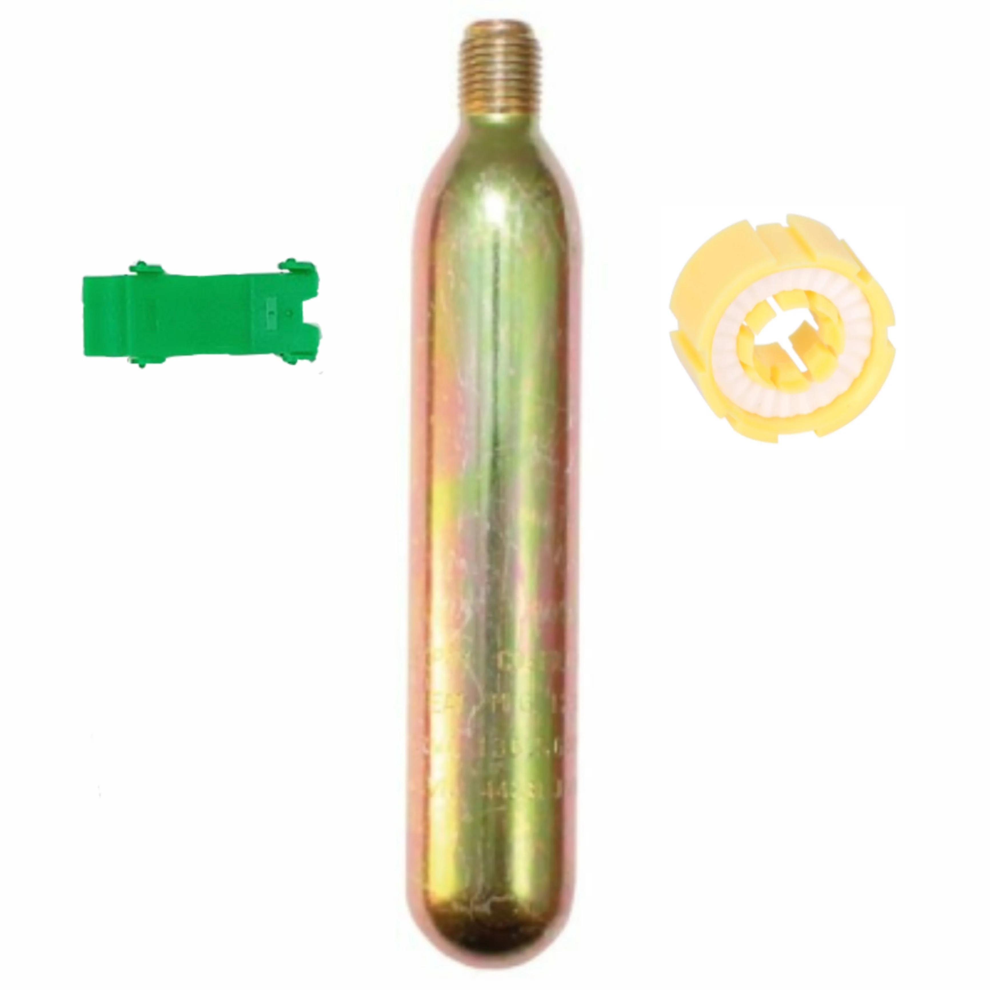 Внутри жилета находится баллончик с зарядом углекислотой 33гр ( жилет поставляется сразу пригодным к эксплуатации).