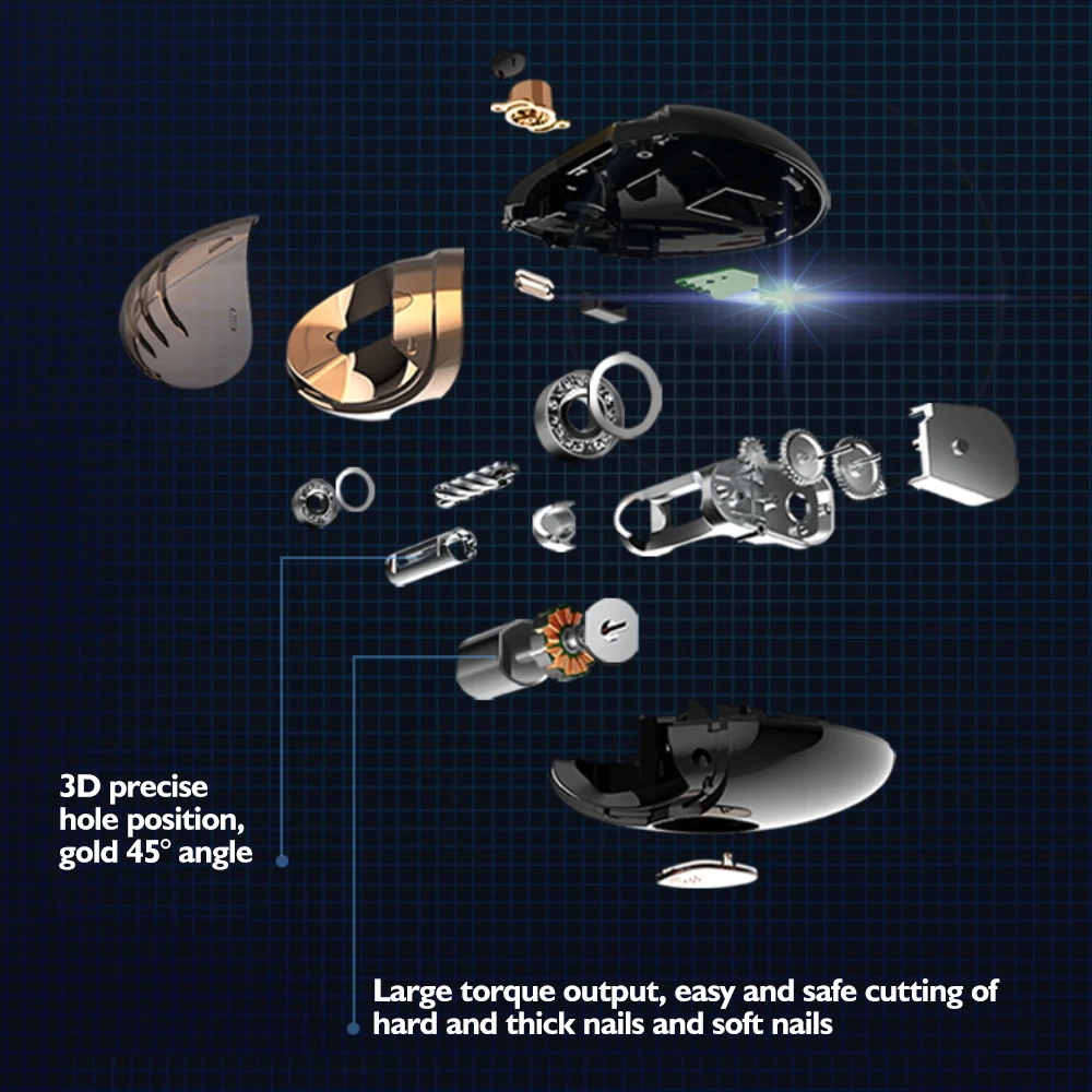 (2) точное положение отверстия 3D, золотой угол 45 °, большой крутящий момент, легкая и безопасная резка твердых и толстых ногтей и мягких ногтей, также доступны для молодых детей и пожилых людей.