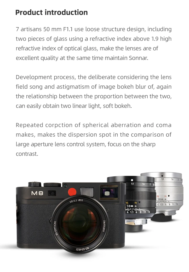 Оптика объектива 7artisans M50mm F1.1 содержит 7 элементов в 6 группах и основана на формуле Sonnar. Он включает в себя два оптических элемента высокой преломления индекса 1,9 для улучшения качества изображения и портативности объектива. НИОКР занимается анализом кривизны поля и влияния астигматизма изображения на изображение и из зон фокусировки. Множество исправлений и улучшений для получения отличного изображения. Использование широкоугольного объектива с диафрагмой F1.1 обеспечивает приятный боке. Остановлено до F1.4, оно улучшает остроту, сохраняя при этом гладкие области, не требующие фокусировки. Повторяющаяся коррекция сферической и хроматической аберрации приводит к очень хорошо контролируемым точкам формы и хорошей контрастности и резкости в области фокусировки этой большой диафрагмы объектива.