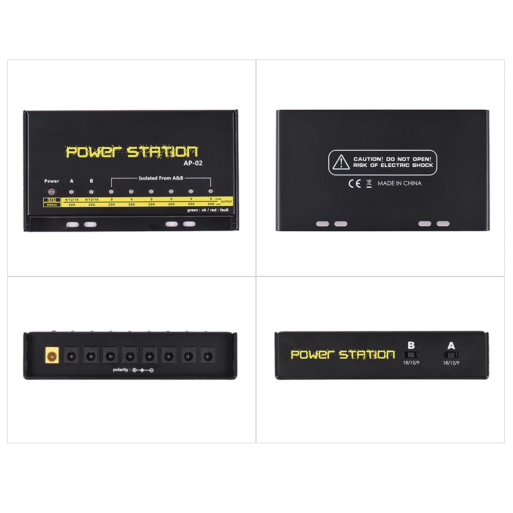 Эта универсальная педалевая плата power supplu probides 8 центровых отрицательных бочек с общей выходной мощностью 2000 мА. Выходы A и B переключаются на 9, 12 или 18 вольт для эффектов питания, которые требуют более высоких скоростей постоянного тока или 9 вольт педалей, которые могут работать на 12 или 18 вольт для большей динамики и головной убор. Эта электростанция полностью регулируется для обеспечения постоянного напряжения и защиты от коротких замыканий и перегрузки.
