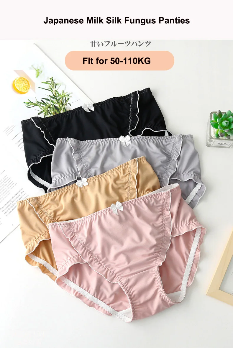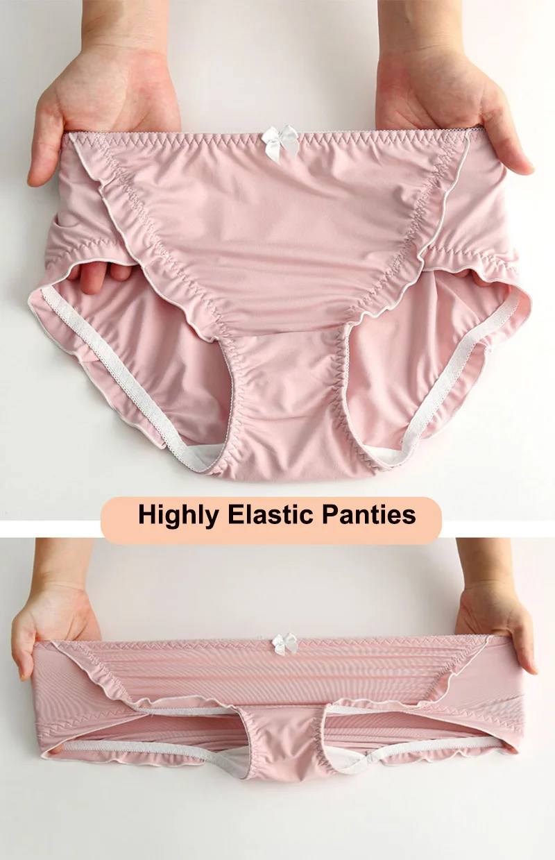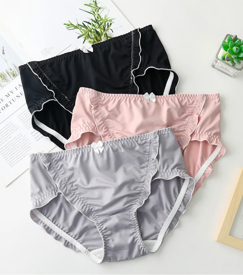 Satin Seamless Panties Women Plus Size Mid Waist Elastic Underpants Cute Bow Briefs Underwear Thin Breathable Black Panties
