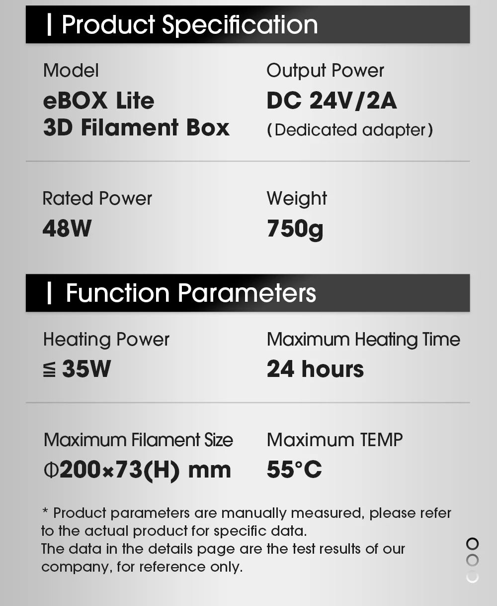 Особенности: EBOX может Выпекать нить при определенной температуре в течение нескольких часов.Он также может весить вашу нить, чтобы вы знали, сколько нити осталось.