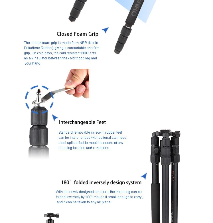 Ножки штатива оснащены взаимозаменяемой винтовой резиной и шипами из нержавеющей стали.