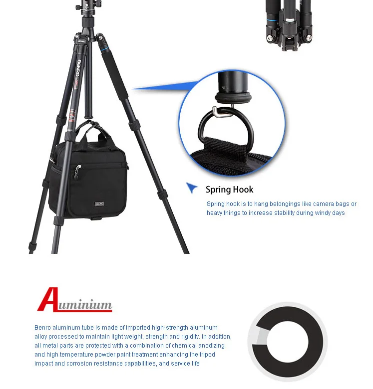 Крючок, расположенный в нижней части центральной колонны, позволяет повесить дополнительный вес от центра тяжести штатива для повышения стабильности.