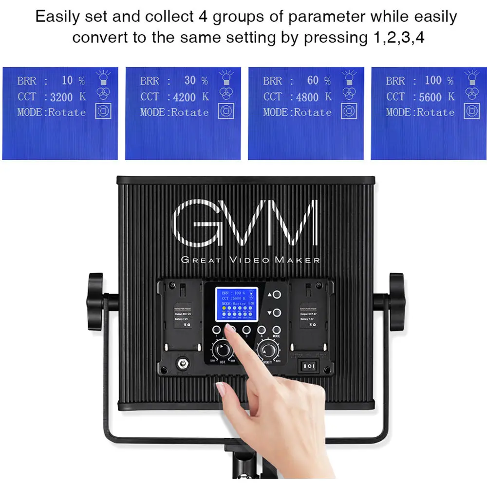 3. Четыре кнопки памяти: GVM светодиодный видео светильник может собрать и запоминать четыре различных групп цветовую температуру и яркость. Если вы хотите использовать одинаковую цветовую температуру и яркость, вы можете использовать его, чтобы уменьшить ваше время.