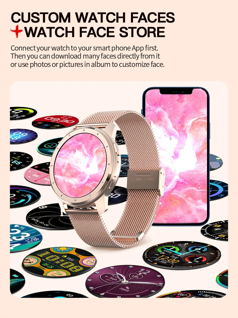 Dial BT, connect headphones to play music, play downloaded music, copy and store music, multiple clock balls, menstrual cycle monitoring, pedometer, calories, distance, multiple exercise modes, turn your wrist to illuminate the screen, monitor sleep and track your running route, Telephone reminder, SMS reminder, sedentary reminder, alarm clock, shaking watch to take photos, tracking heart rate and blood pressure, heart rate monitoring, continuous heart rate monitoring.