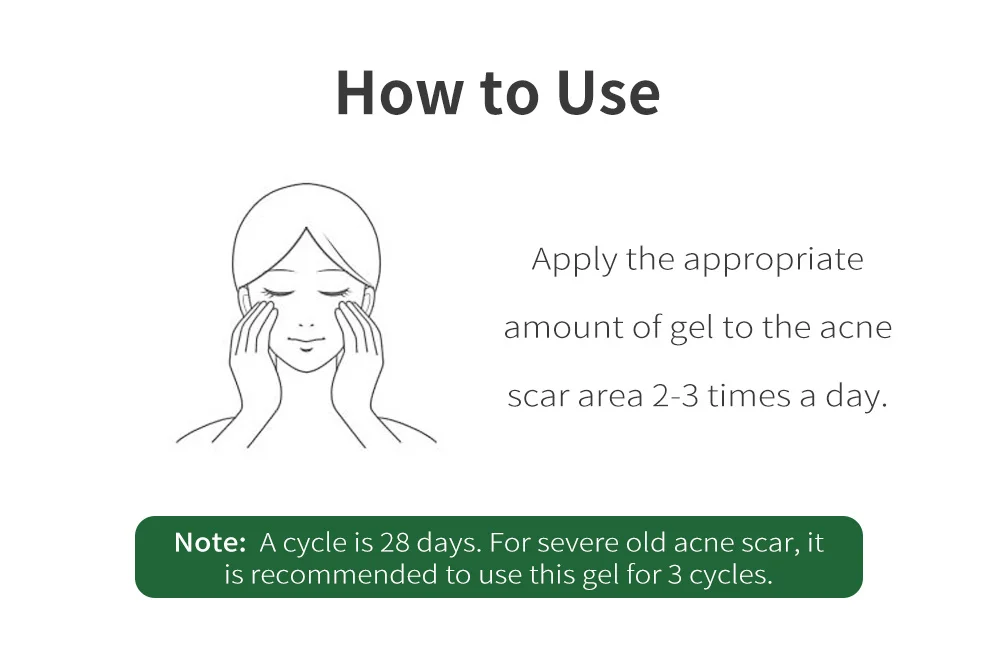 Примечание: цикл составляет 28 дней. Для тяжелого старого шрама от акне рекомендуется использовать этот гель в течение 3 циклов.