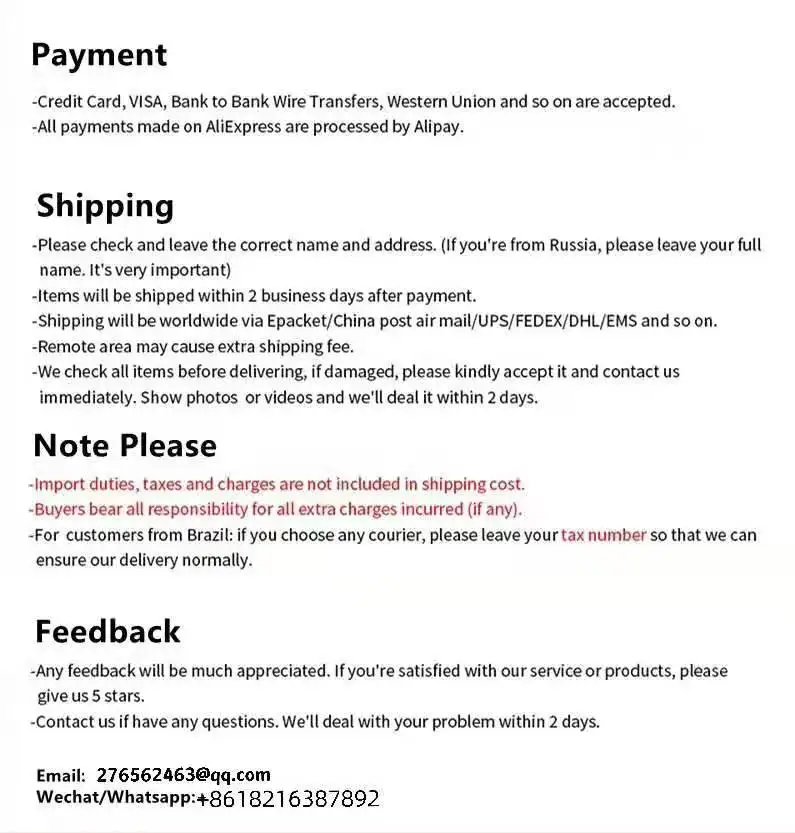 1. Клиенты из Бразилии: если вы выбираете DHL, пожалуйста, сообщите нам ваш Налоговый идентификатор, который является требованиями DHL, но мы будем следовать за вами, чтобы заполнить объявленную стоимость, не woRry.