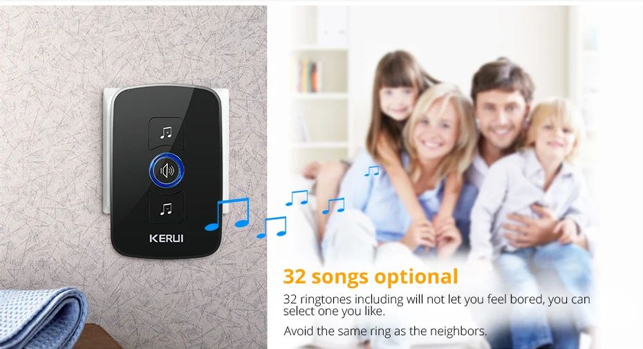 Беспроводной дверной звонок использует передовые технологии беспроводного приема и отправки, мощную микрокомпьютерную систему управления, высокую емкость и превосходную технологию обработки голоса, до 32 песен с надежной и стабильной производительностью.