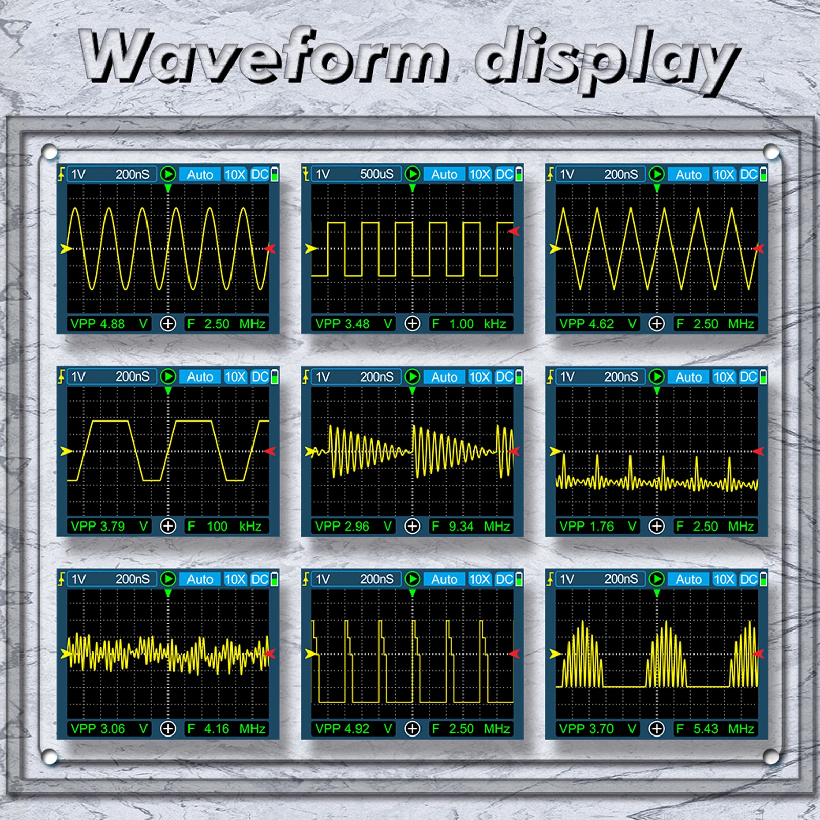 Functions: one ke-y oscilloscope, three scan modes: auto, normal and single, 12 kinds of test data, can store 2500 waveforms, support thumbnail browsing.