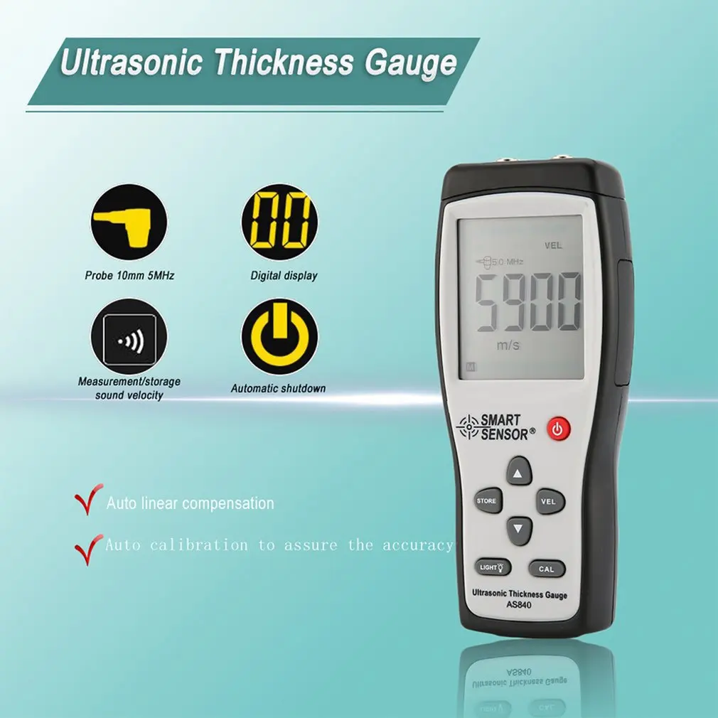 Особенности: 1. Ультразвуковой толщиномер, автоматическая калибровка для обеспечения точности. 2. Автоматическая линейная компенсация, режим автоматического отключения питания. 3. Измерение скорости звука, 12 звуковых скоростей для различных материалов. 4. Компактный размер, легкий вес, легко носить с собой и работать. 5. Большой ЖК-дисплей с переключаемой подсветкой. Описание: 1. Принимает принцип ультразвукового измерения и контролируется микропроцессором. 2. Высокоточный портативный, с компактным размером и легким весом легко носить с собой и работать. 3. Широко используется в измерительных материалах, которые являются хорошими ультразвуковыми проводниками, такими как металл, пластик, керамика, стекло и т. д. Характеристики: Модель: AS840 Дисплей: 4-цифровой ЖК-дисплей Дисплей Минимальный дисплей: 0,1 мм Диапазон измерения: от 1,2 до 225,0 мм (сталь) Рабочая частота: 5 МГц Точность: (1% H + 0,1) мм, H обозначает измеренную толщину. Минимальный предел для измерения трубки: 20*3 мм (сталь) Диапазон скорости звука: от 1000 до 9999 м/с Измерение скорости звука с заданной толщиной: Диапазон измерения: от 1000 до 9999 м/с. При заданной толщине> 20 мм Точность +/-5%; При заданной толщине <20 мм Точность +/-1 мм/ч * 100%. Рабочая температура: 0 °C ~ 40 °C Рабочий ток: Нормальный рабочий ток: 50 мА С подсветкой включение тока: 120 мА Постоянный ток: 20uA Мощность питания: 1,5 V AAA * 3 (не прилагаются) Автоматическая нулевая Калибровка: Y Автоматическая линейная компенсация: Y Индикатор соединения: Y Индикация батареи/автоматическое выключение питания: Y Размер изделия: 160x60x30 мм Посылка включает в себя: 1 * цифровой толщиномер AS840 1 * Блок Для примера 1 * Соединительный агент 1 * преобразователь 1 * полипропиленовый упаковочный ящик 1 * Руководство по эксплуатации (на английском языке)