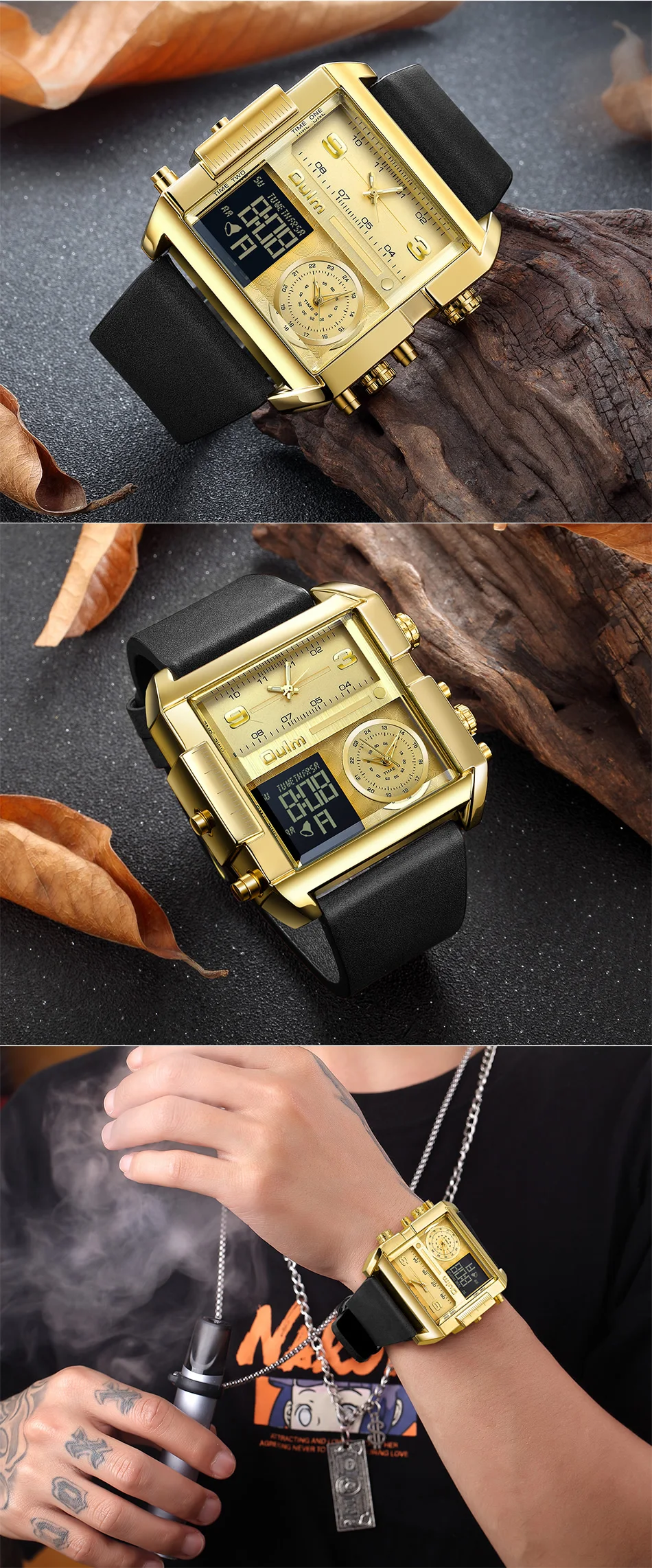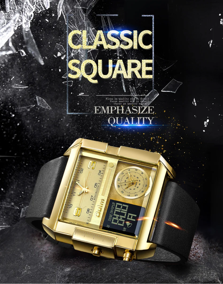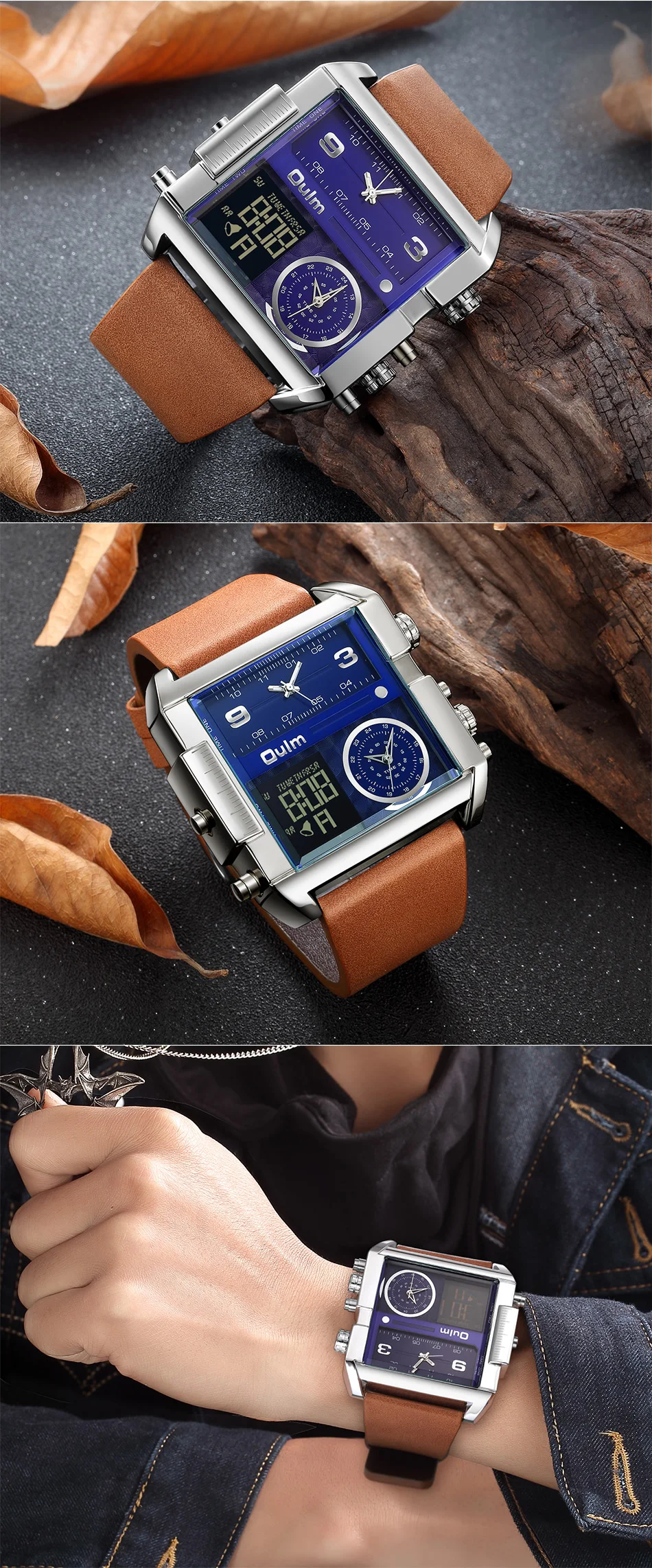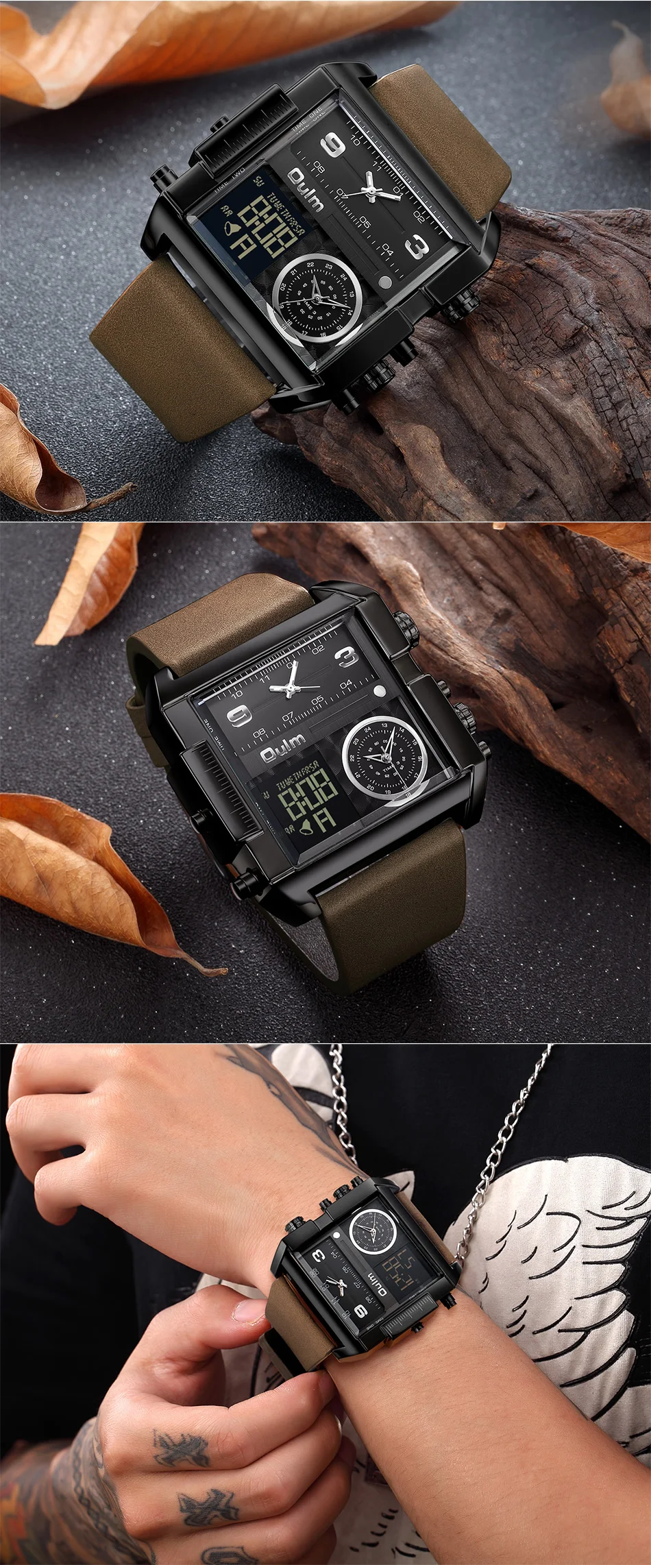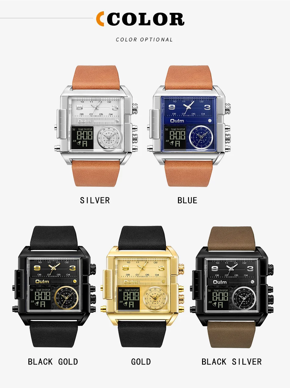 Oulm LED цифровые часы для мужчин люксовый бренд два часовых пояса кварцевые большие часы из натуральной кожи мужские спортивные часы Relogio Masculino