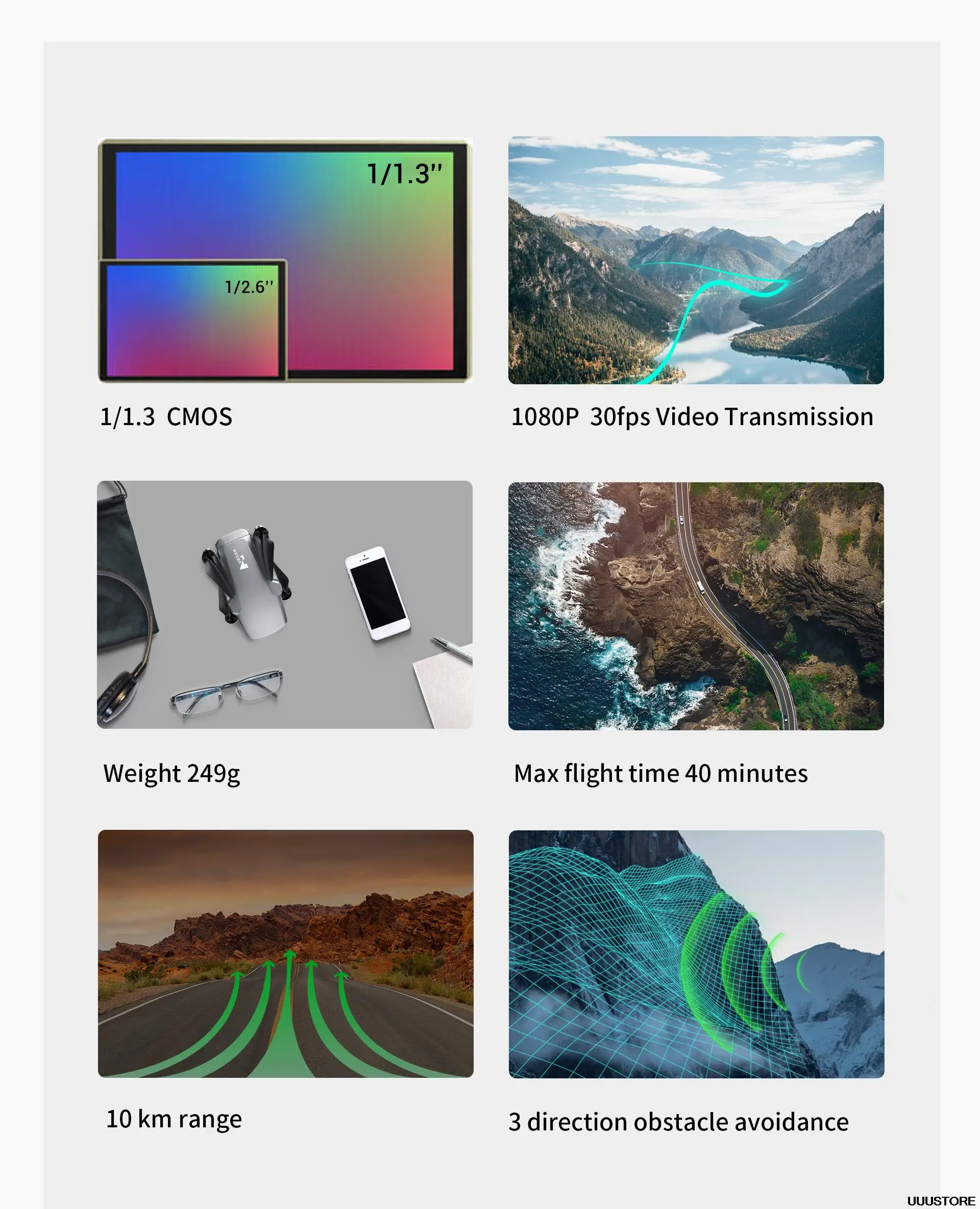 С 1/1.3CMOS, поддержка 1080P 30fps видео, вес 249g, макс. время полета 40 минут, диапазон 10 км, 3 направления избегания препятствий