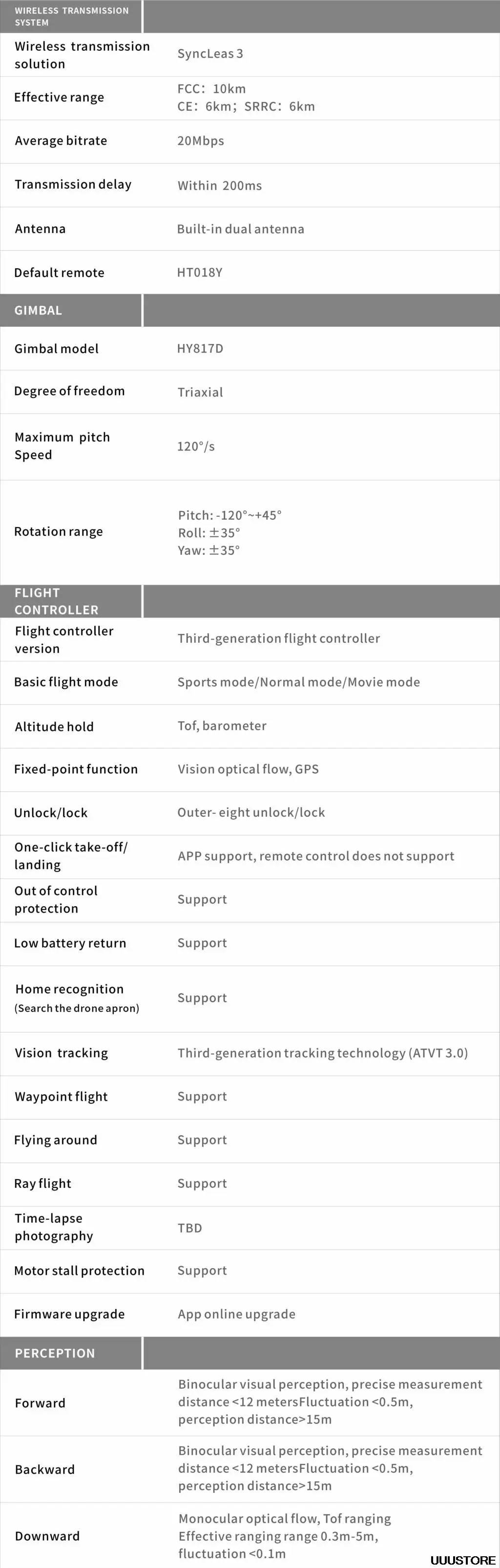 √Визуальное отслеживаниеТехнология отслеживания третьего поколения (ATVT 3,0)Полетный путь√Летающий вокруг√Луч полета√Покадровая фотографияТБДЗащита двигателя√Обновление прошивкиОнлайн-обновление приложения Система обнаруженияОсобенности: