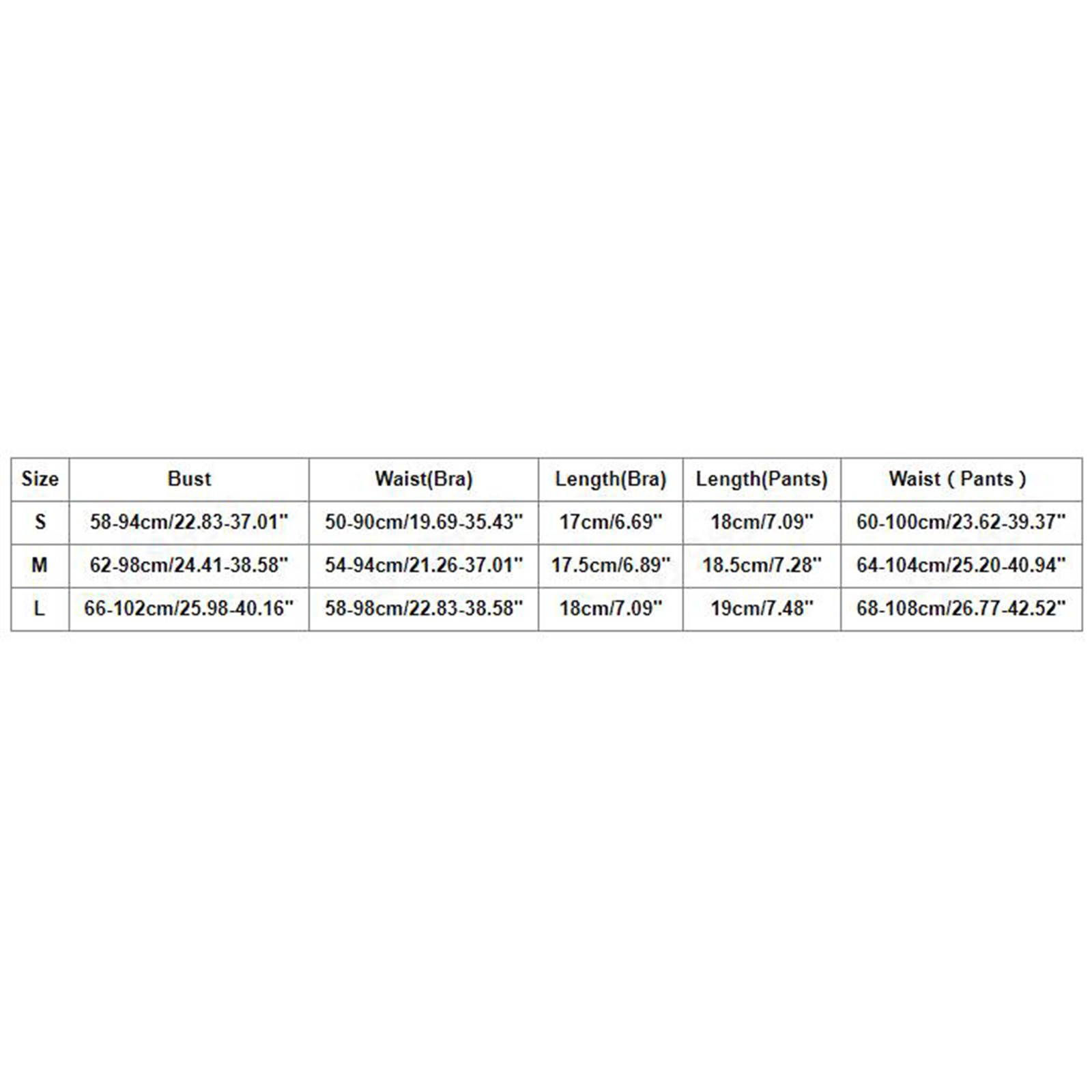 Size Bust Waist(Bra) Length(Bra) Length(Pants) Waist(Pants) S 58-94cm/22.83-37.01'' 50-90cm/19.69-35.43'' 17cm/6.69'' 18cm/7.09'' 60-100cm/23.62-39.37'' M 62-98cm/24.41-38.58'' 54-94cm/21.26-37.01'' 17.5cm/6.89'' 18.5cm/7.28'' 64-104cm/25.20-40.94'' L 66-102cm/25.98-40.16'' 58-98cm/22.83-38.58'' 18cm/7.09'' 19cm/7.48'' 68-108cm/26.77-42.52''Size:S Bust:58-94cm/22.83-37.01'' Waist(Bra):50-90cm/19.69-35.43'' Length(Bra):17cm/6.69'' Length(Pants):18cm/7.09'' Waist(Pants):60-100cm/23.62-39.37'' Size:M Bust:62-98cm/24.41-38.58'' Waist(Bra):54-94cm/21.26-37.01'' Length(Bra):17.5cm/6.89'' Length(Pants):18.5cm/7.28'' Waist(Pants):64-104cm/25.20-40.94'' Size:L Bust:66-102cm/25.98-40.16'' Waist(Bra):58-98cm/22.83-38.58'' Length(Bra):18cm/7.09'' Length(Pants):19cm/7.48'' Waist(Pants):68-108cm/26.77-42.52''