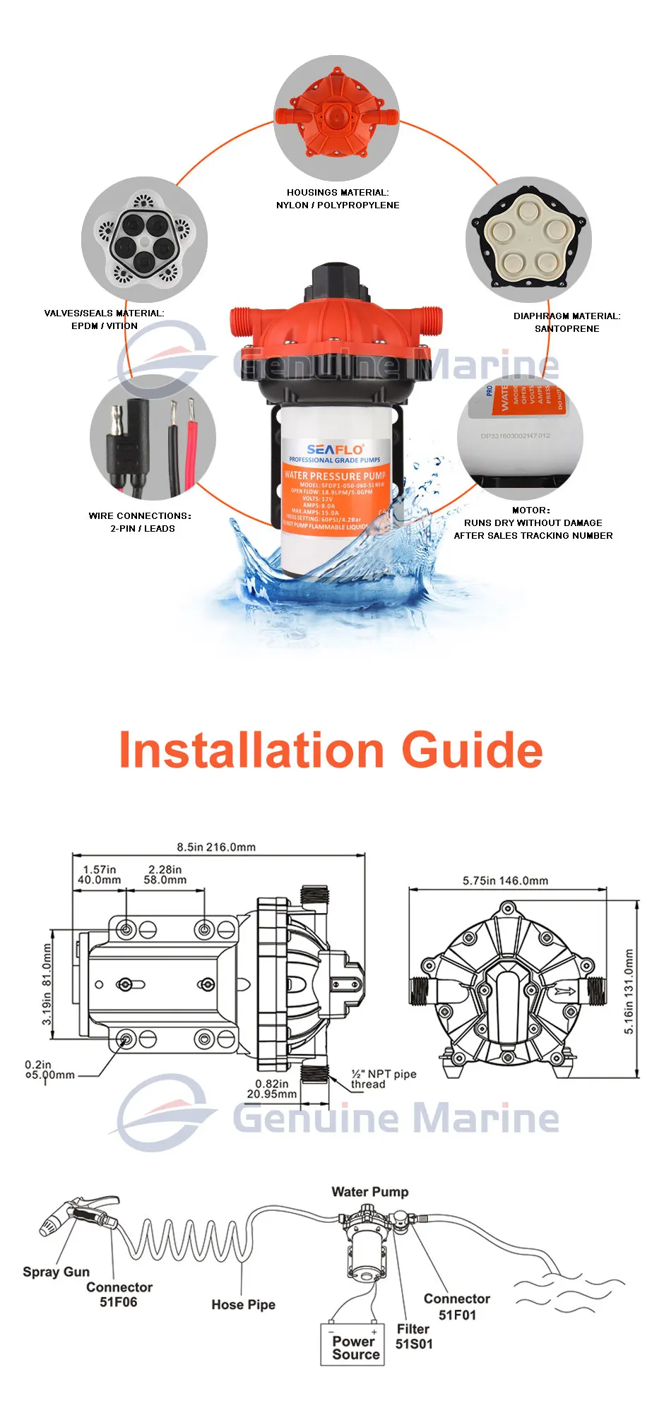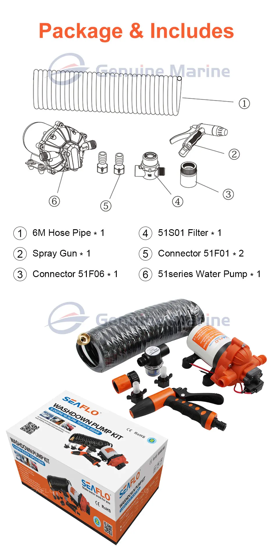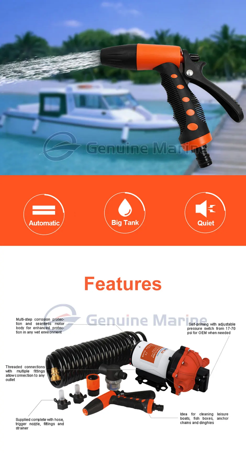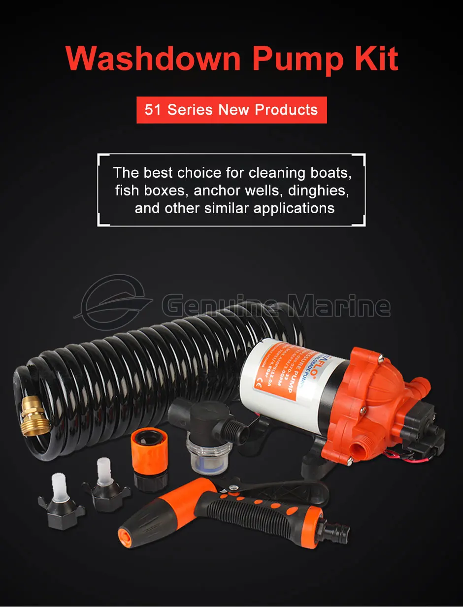 Наш сверхмощный набор для промывки. Лучший выбор для очистки лодок, ящиков для рыбы, якорных колодцев, кораблей и других подобных применений. Этот насос обладает огромной мощностью 5 ГПМ. Этот насос имеет переключатель по требованию, поэтому насос автоматически включается, когда вы сжимаете ручку распылителя. При обрезании 70 фунтов на квадратный дюйм это оказывает давление, чтобы избавиться от упрямого мусора. Подходит для использования в пресной и соленой воде. Отлично подходит для больших тараканов, установки на присоске и даже для чистки дома. Предназначен для легкого, аккуратного, безопасного хранения. Состоит из защита от ультрафиолета, 18,5 "(6 м) спиральный 5/16 O.D шланг, Распылительная насадка с регулируемым наконечником и контурная ручка и бронзовой арматуры.