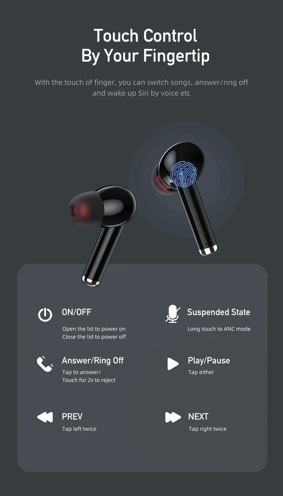 Сенсорное управление кончиком пальца касанием пальца, вы можете переключать композиции, отвечать/выключать звонок и просыпаться Siri голосом и т. д.