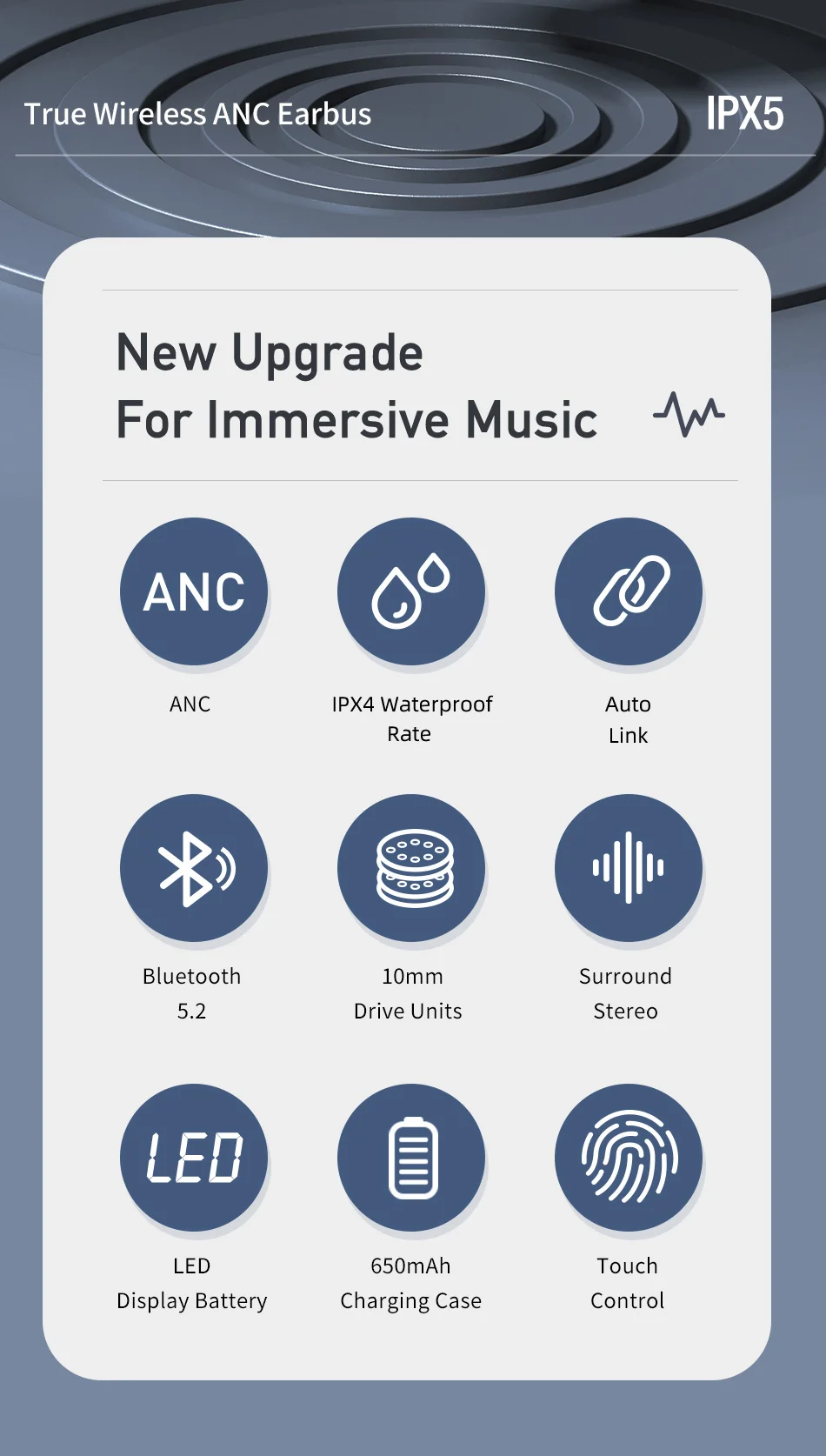 Новое обновление lmmersed in Music World,ANC Bluetooth наушники, сенсорное управление, светодиодный дисплей батареи, активное шумоподавление, IPX4 водонепроницаемость, 10 мм приводные блоки, объемное стерео, автоматическое соединение, сенсорное управление, bluetooth V5.2, 650mAhCharging Case