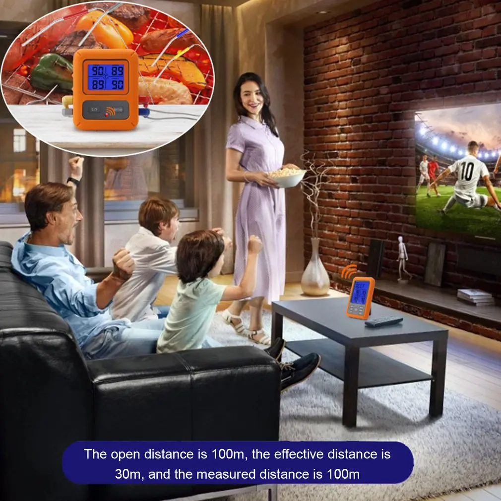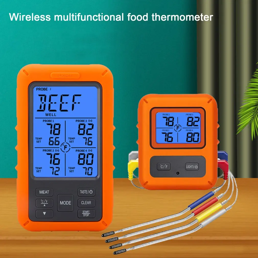 3,4 канал: четырехканальная конструкция может контролировать температуру 4 пищевых продуктов. -Выберите из 8 видов мяса (говядина, ягненок, телятина, курица, индейка, свинина, рыба, бургер), с 5 минут выбора вкуса, приемник будет оповещать, когда температура достигнет значения сигнала тревоги, и цвет подсветки экрана станет оранжевым, «LLL» Будет отображаться ниже самой низкой температуры (-20 ° C), и «HHH» будет отображаться выше самой высокой температуры (300? ° C).