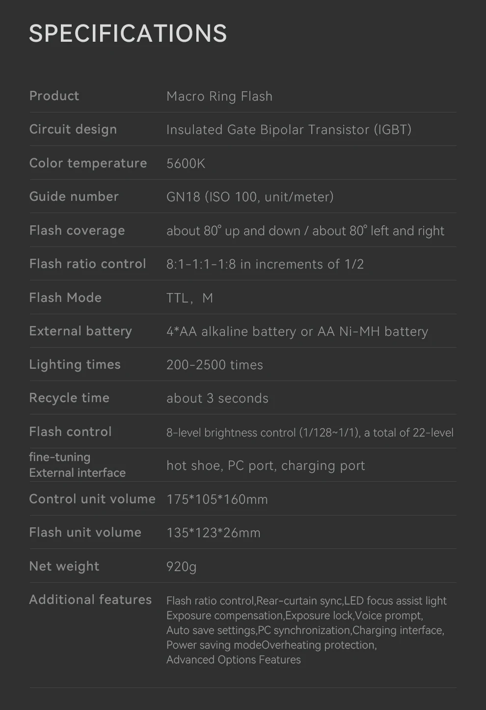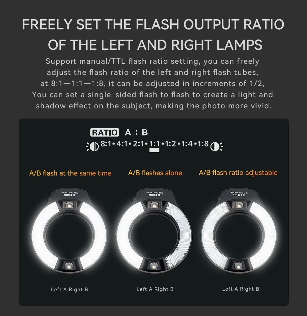 Поддержка настройки коэффициента вспышки M/TTL, регулировка коэффициента вспышки трубки A и B или создание только одной вспышки может производить тень на тему, что позволяет фото достичь скульптурного эффекта.