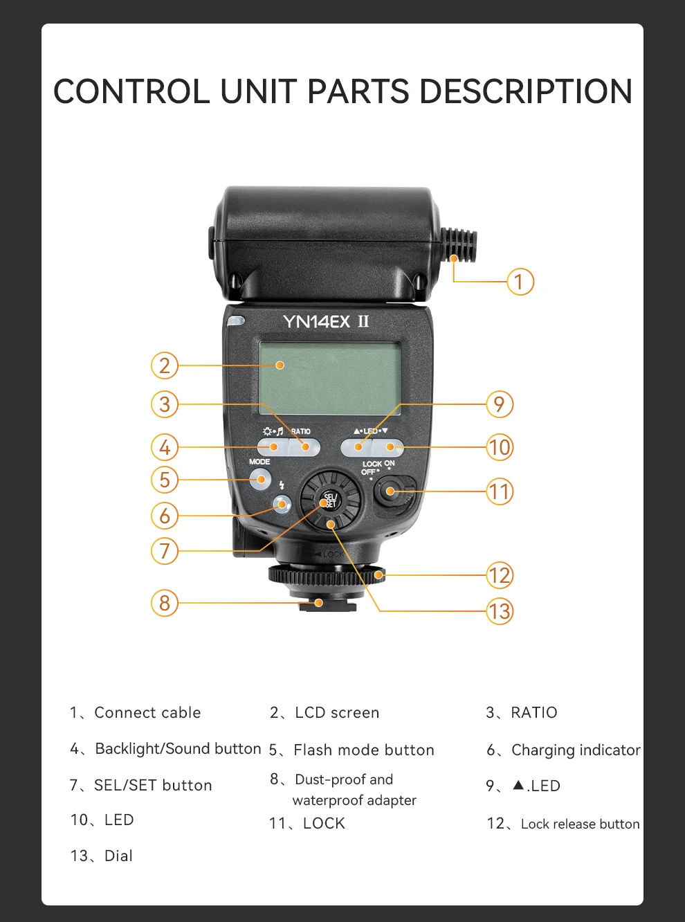 YN14EXII оснащен внешним гнездом питания, который отвечает требованию пользователя высокоскоростного времени рециркуляции.