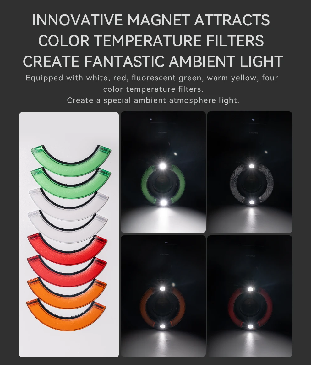 Оснащен четырьмя видами цветовых температурных фильтров: белый, красный, флуоресцентный зеленый и теплый желтый, магнитный метод рисования для фильтров прост в использовании.