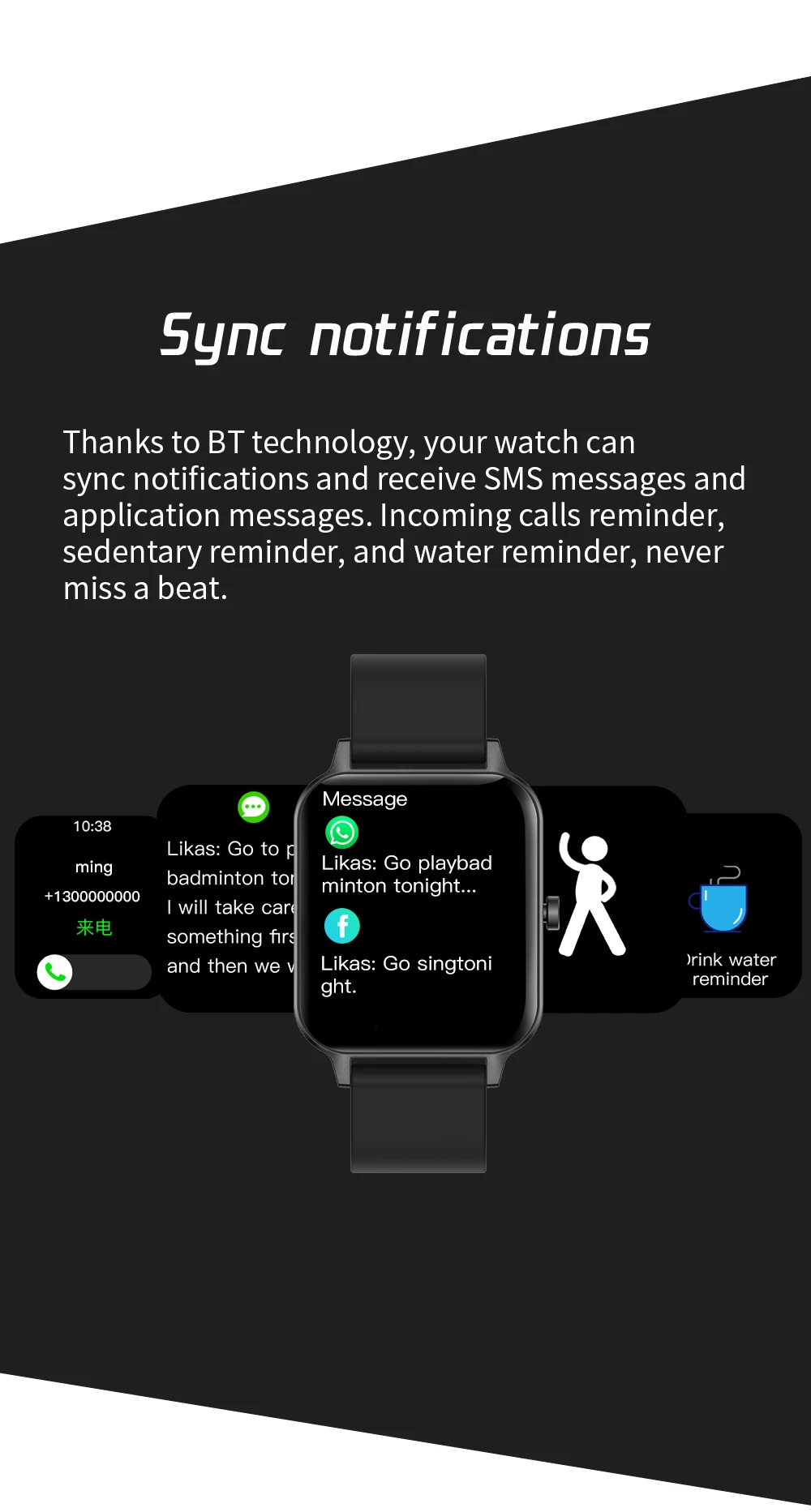 * Уведомления: уведомления об информации, входящих звонках и sms-сообщениях, напоминания о сидячем положении, напоминания о воде