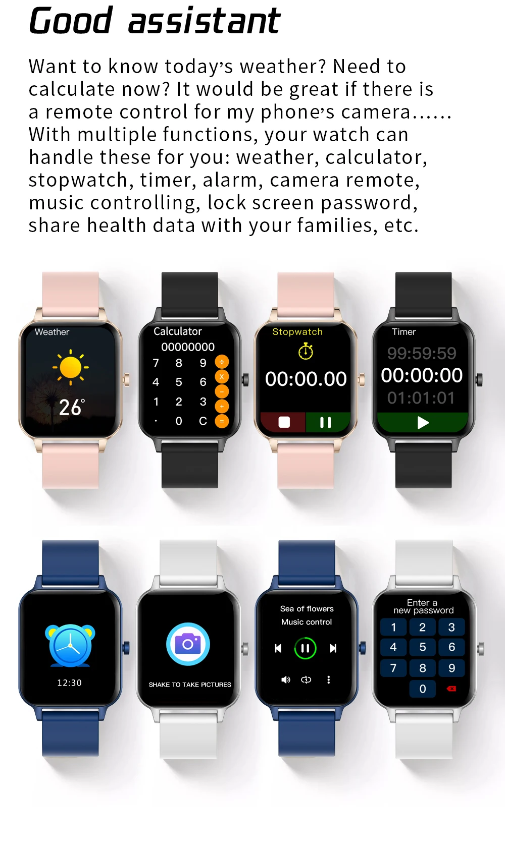 * Помощник по жизни: погода, калькулятор, секундомер, таймер, будильник, пульт дистанционного управления камерой, управление воспроизведением музыки, блокировка паролей, обмен данными о здоровье с семьями