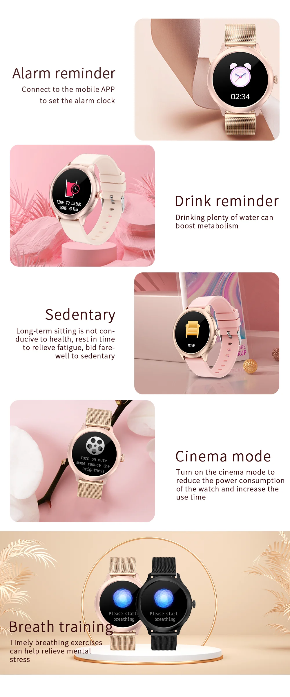 6. Другие функции: выбор циферблата, мультиспортивный режим, включение экрана запястья, отображение погоды, отображение времени, удаленная камера, независимое воспроизведение музыки, не беспокоить настройки режима, поиск браслетов, найти мобильные телефоны, WeChat sports.