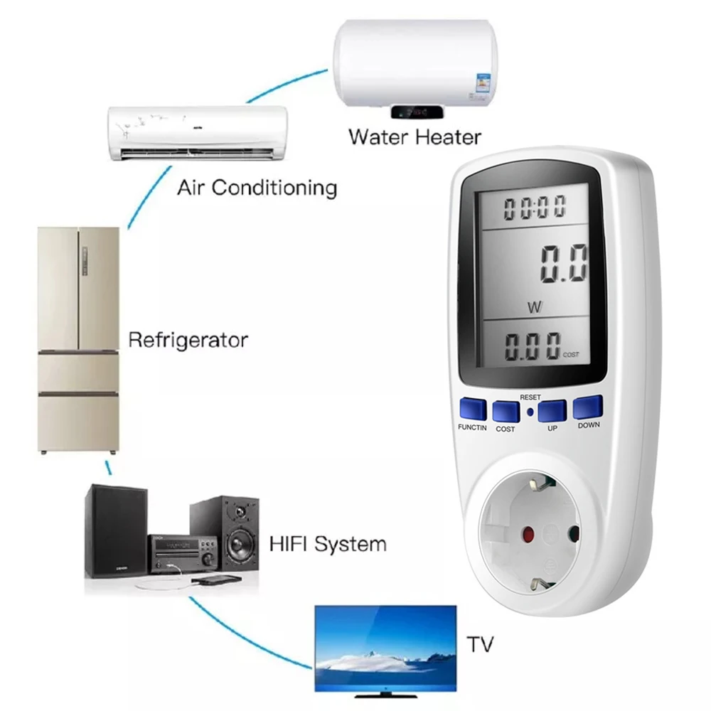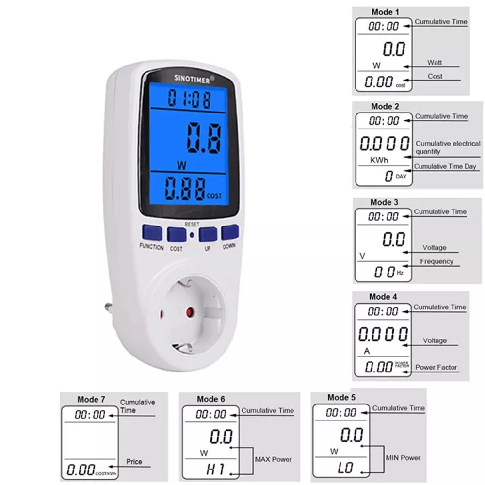 9. Измерьте различные параметры + Функция защиты от перегрузки: мощность (Вт), энергия (кВтч), вольт, ампер, герц, коэффициент мощности и Максимальная мощность (Вт), время, дней (ваш счет за электричество в основном основан на кВтч).
