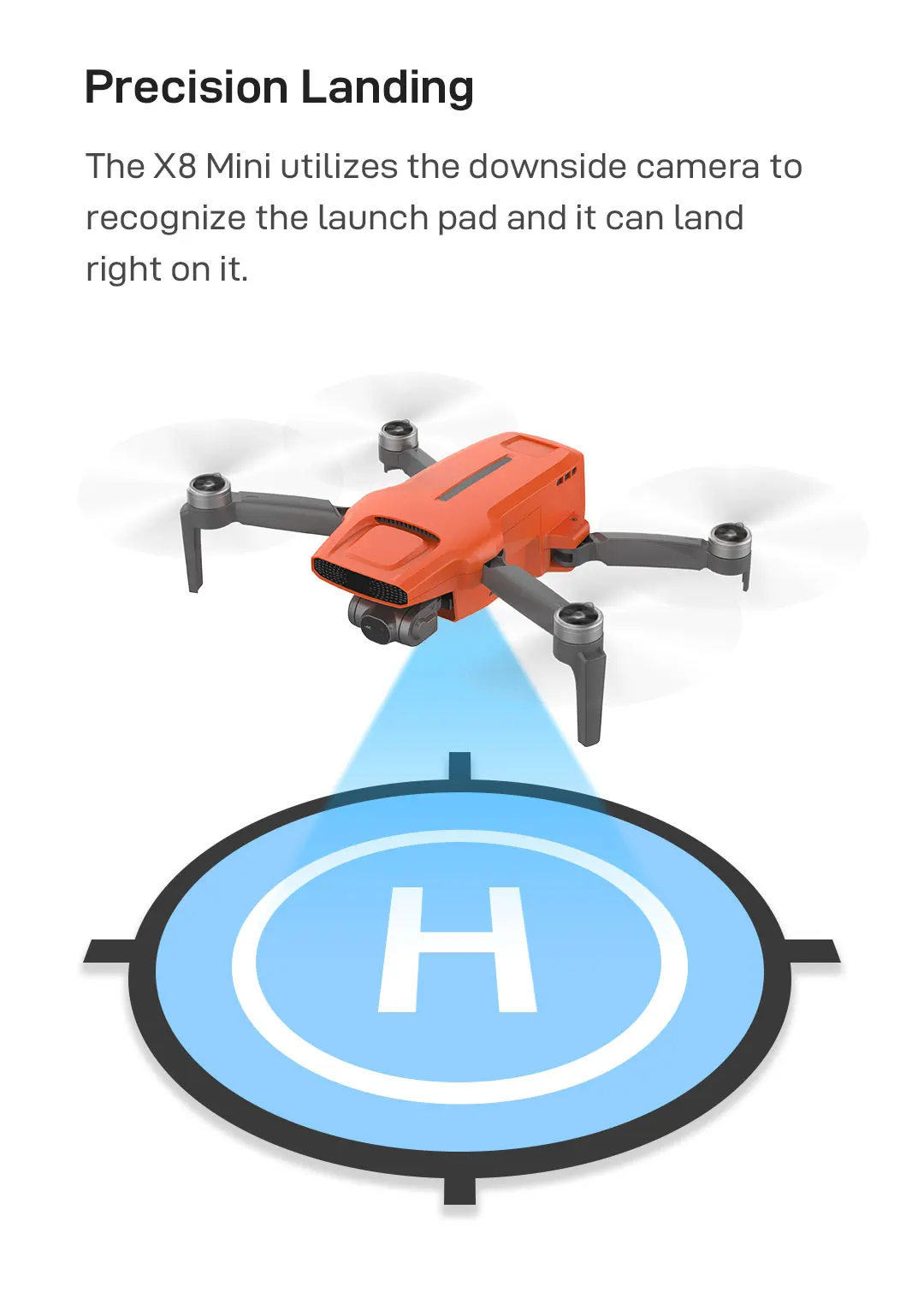 19. Точность посадки: X8 Mini использует нижнюю камеру для распознавания пусковой площадки, и она может приземлиться прямо на нее.