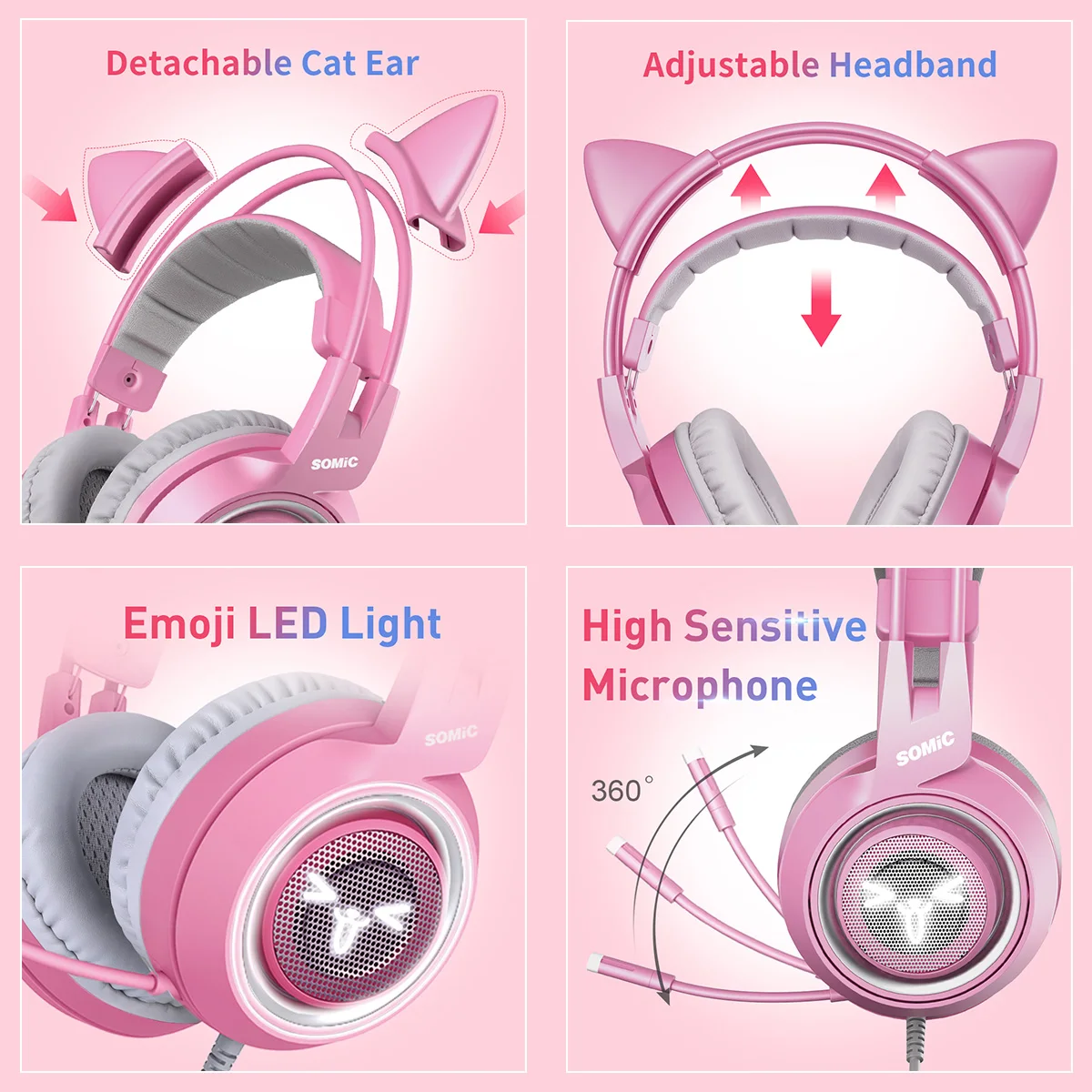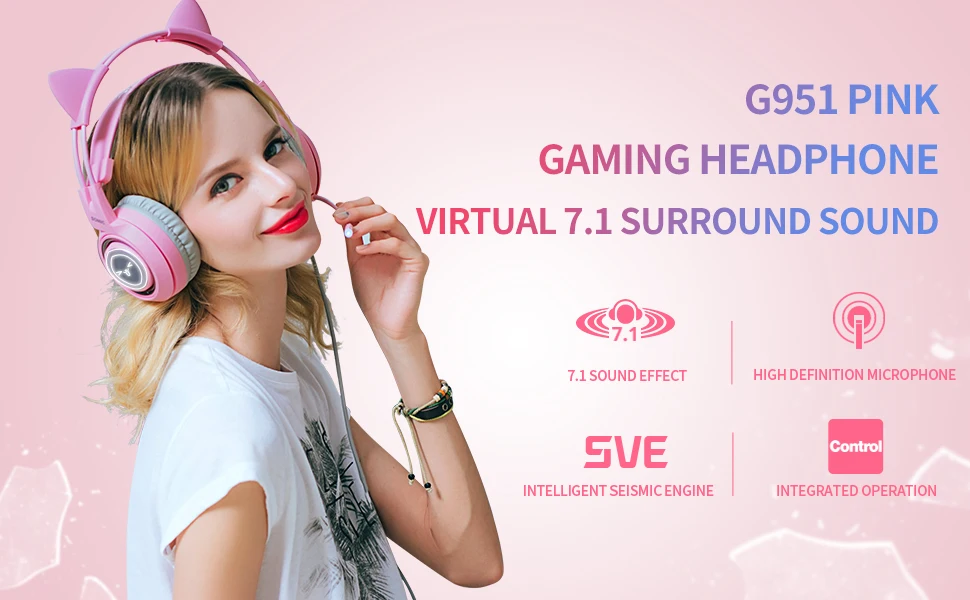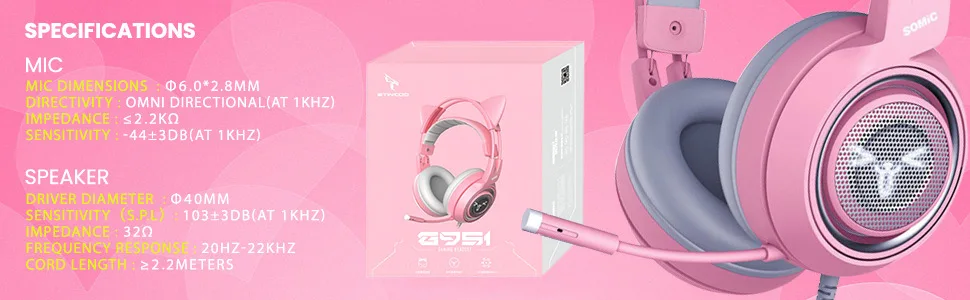 Реалистичная вибрационная технологияС сильной вибрационной системой, обеспечивающей более оптимальный игровой и видео 4D опыт.* Настоящий виртуальный опыт (только G951 розовый)Многоканальная технология Vitual 7,1 создает более реалистичные игровые звуки и помогает точно создать игровую сцену.* Красивый внешний видС розовыми внешними и съемными кошачьими ушками, привлекающими молодых девушек и приятным подарком для девушек, женщин и детей.* Дышащий светодиодный светильник (только G951 розовый с светодиодный, G951s розовый без светодиодный)Дышащий светодиодный светильник на наушнике приносит сильный игровой эффект. Наушники большого размера с выдающимся пассивным шумоподавлением обеспечивают меньше помех и больше комфорта.* Высококачественный микрофонВысококачественные динамики обеспечивают высокую, среднюю и низкую частоту в деталях. Полный контроллер для бесперебойной работы.Характеристики:Название бренда: SOMICНомер модели: G951 розовыйВерсия: Vertual 7,1 многоканальныйДиапазон провода: ≈ 2,6 мПривод: 6,0 ммРазмер микрофона: Φ6.0X2.8mmЧувствительность микрофона: -44 ± 2 дБ (при 1 кГц)Направленность микрофона: всенаправленныйСопротивление микрофона: ≤ 2,2kΩДиаметр динамика: 40 ммЧувствительность динамика: 115 ± 3 дБ (при 1 кГц)Частотная характеристика: 20 Гц-22 кГцСопротивление динамика: 32 Ом + 15%Вес гарнитуры: 420 г каждаяОсновные характеристики продукта MIC