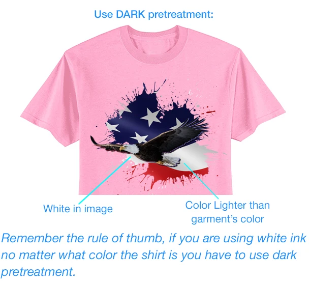 Существует очень простое правило: если вы печатаете любые белые чернила, вы должны использовать темную pretreatment независимо от цвета рубашки. Таким образом, его следует назвать «Белой чернильной» предварительной обработкой, но затем он запутается с белыми рубашками.