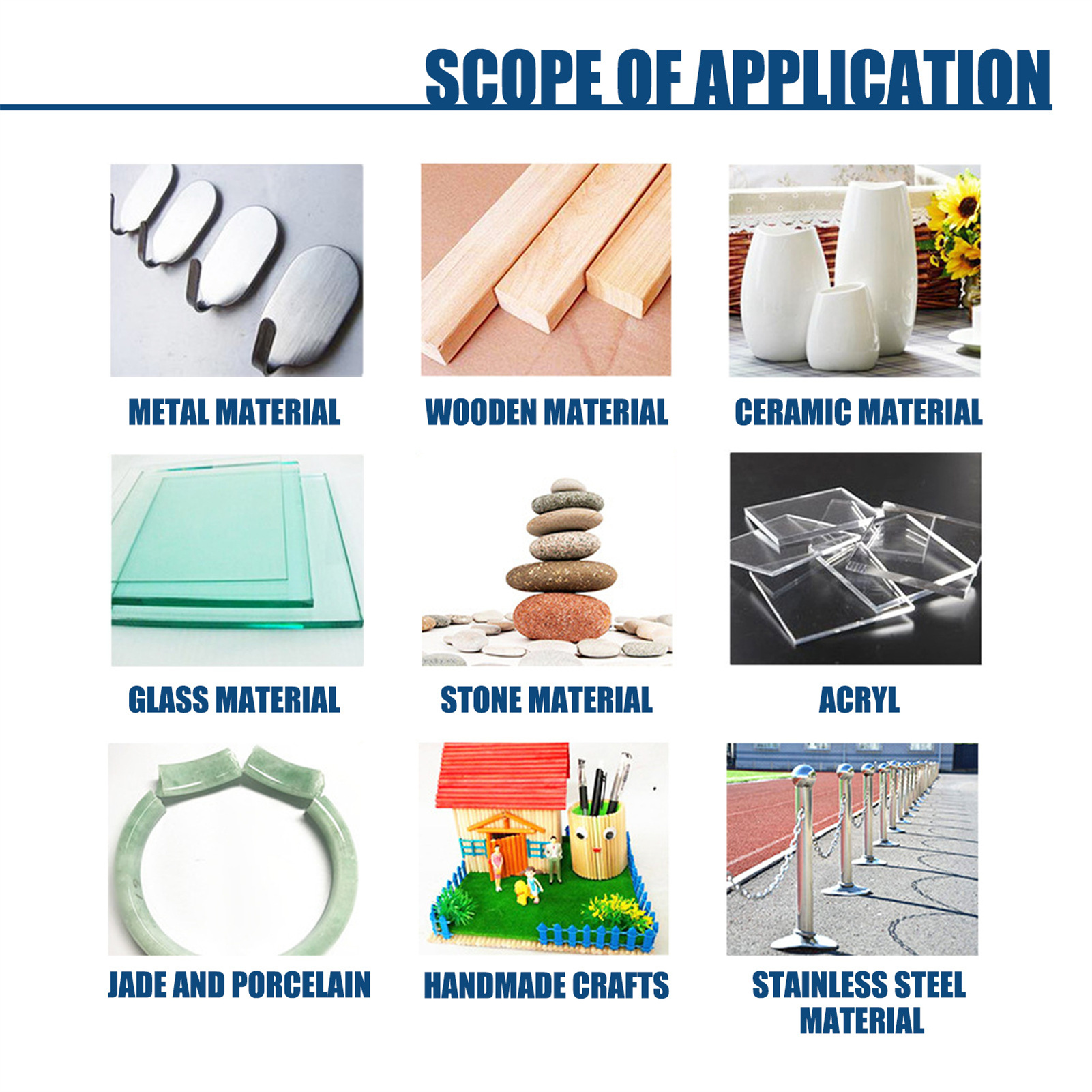 1. Отличная стабильность хранения, широкий спектр склеивающих материалов, и может широко использоваться для самоадгезии и взаимной адгезии металлов, керамики, пластмассы и дерева