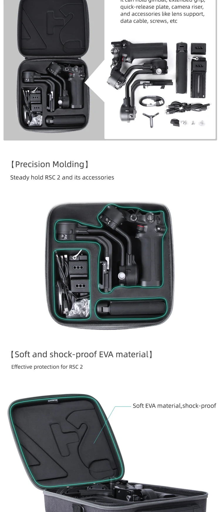 -Он может удерживать стабилизатор RSC 2, расширенную рукоятку, быстроразъемную пластину, стояк камеры и аксессуары, такие как поддержка объектива, кабель для передачи данных, винты и т. д.