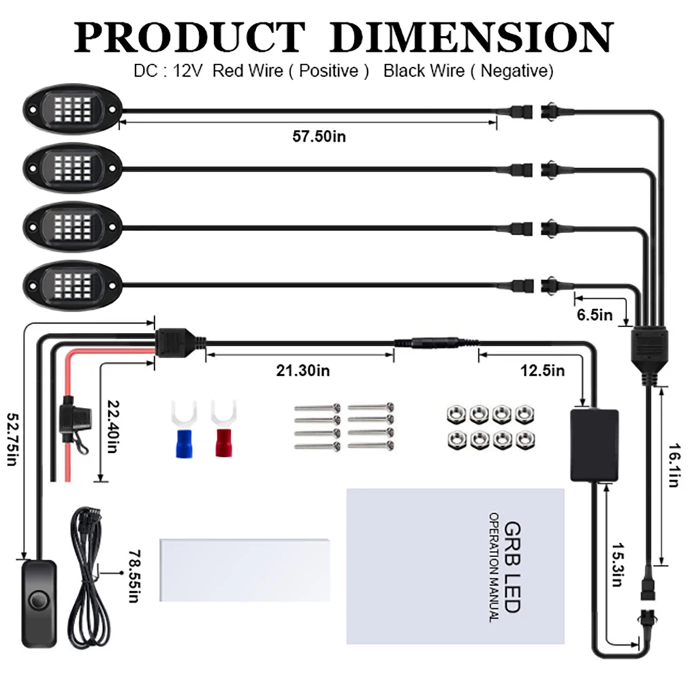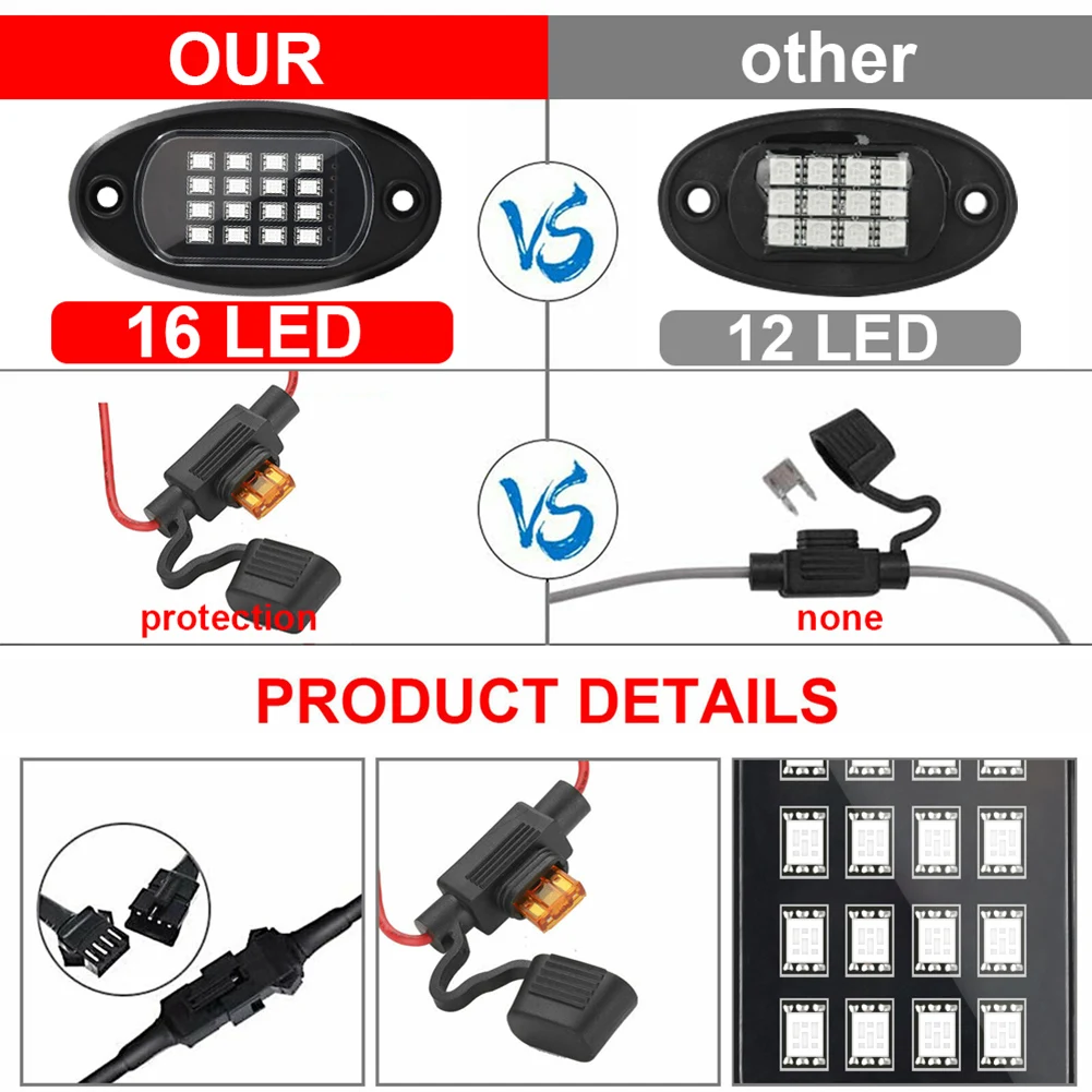 *5. Widely Use: DC12V, Rock lamp kits can be widely used in off-road, SUV, four-wheeled vehicles, ATV, UTV, trucks, cars, boats, golf carts and bottom lamp shade lamp kits. Use them under your vehicle or as interior or exterior lights.